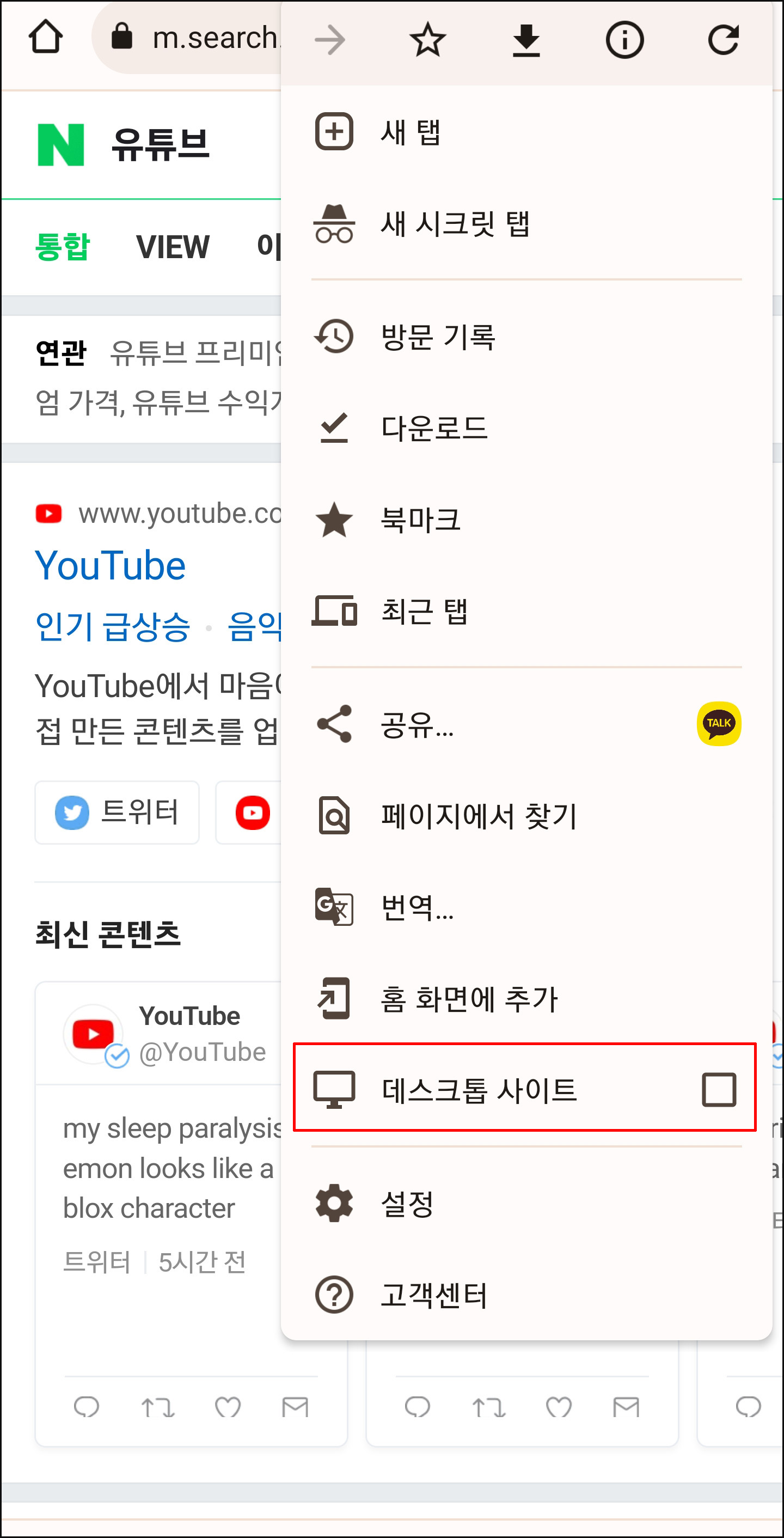 일단, 유튜브 어플이 아닌 크롬 어플로 들어가서 유튜브에 접속을 해야 합니다. 그리고 유튜브의 세로 3점이 아닌 구글 크롬의 3점을 클릭하여 데스크톱 사이트에 체크를 해줍니다.