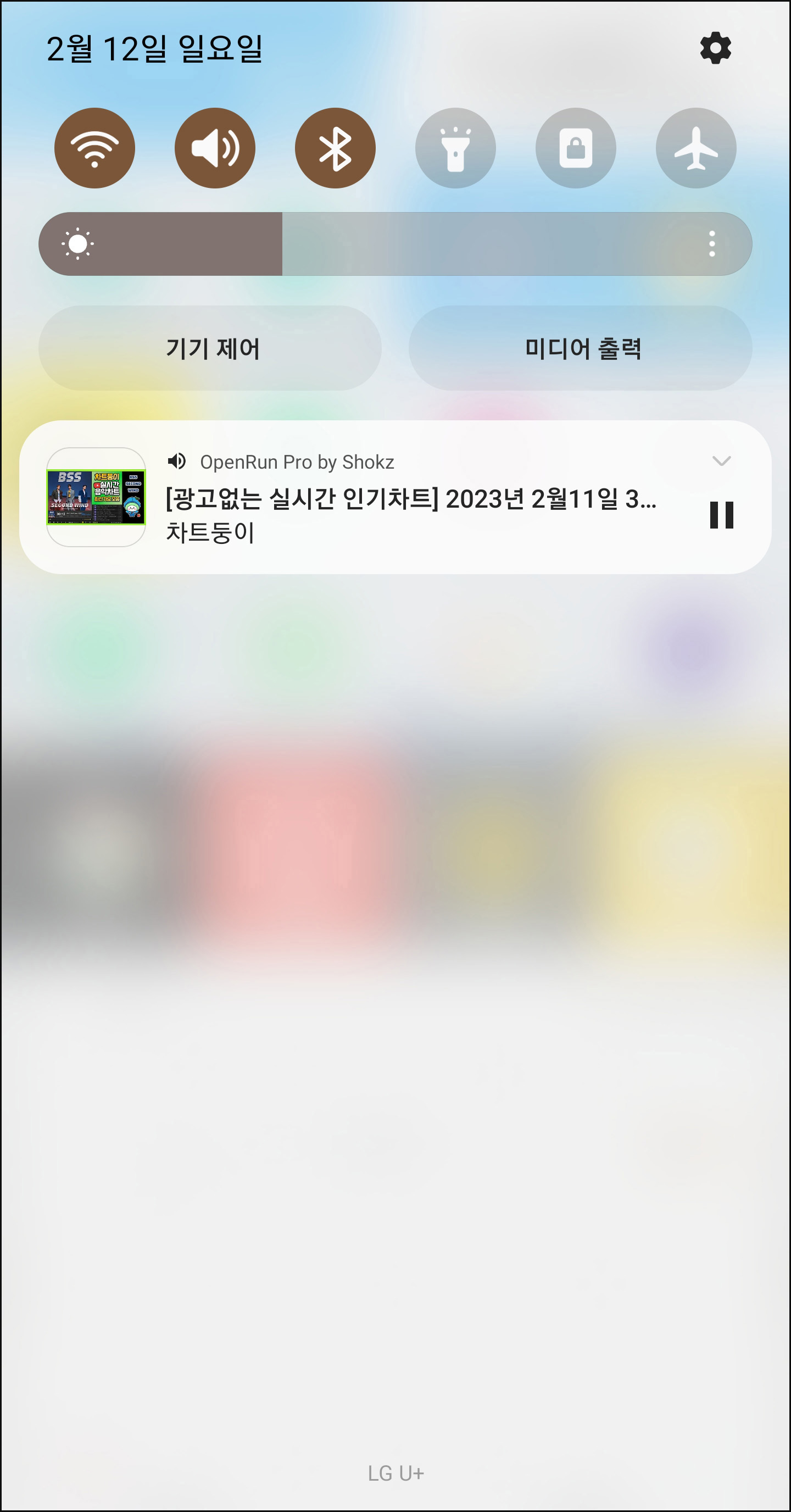 여기서 휴대폰 윗 부분을 아래로 드래그 해서 쓸어 내리면 플레이어가 떠있는 것을 확인하실 수 있으실 겁니다. 여기서 플레이 버튼을 클릭 하시면 음악이 나오게 됩니다. 과정을 거쳐 설정하시면 프리미어 구독자처럼 유튜브에서 벗어나도 음악이 계속 흘러나오게 됩니다.