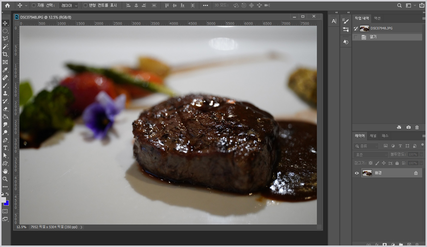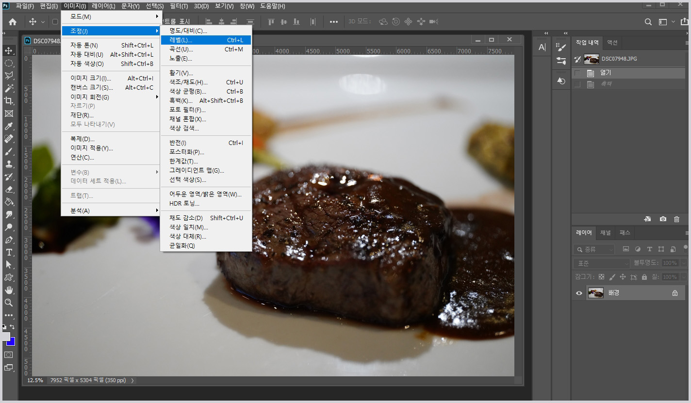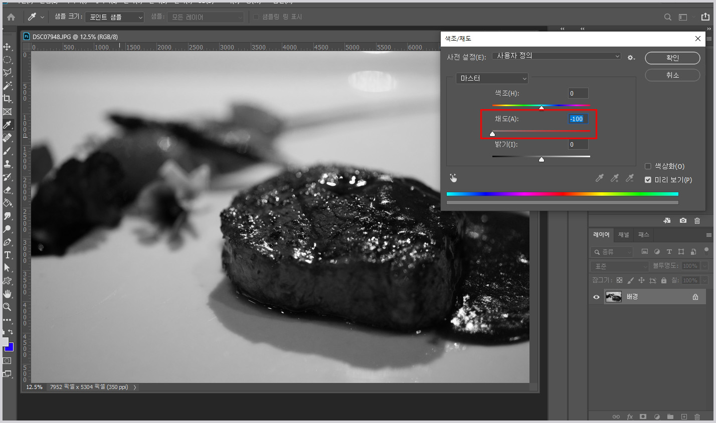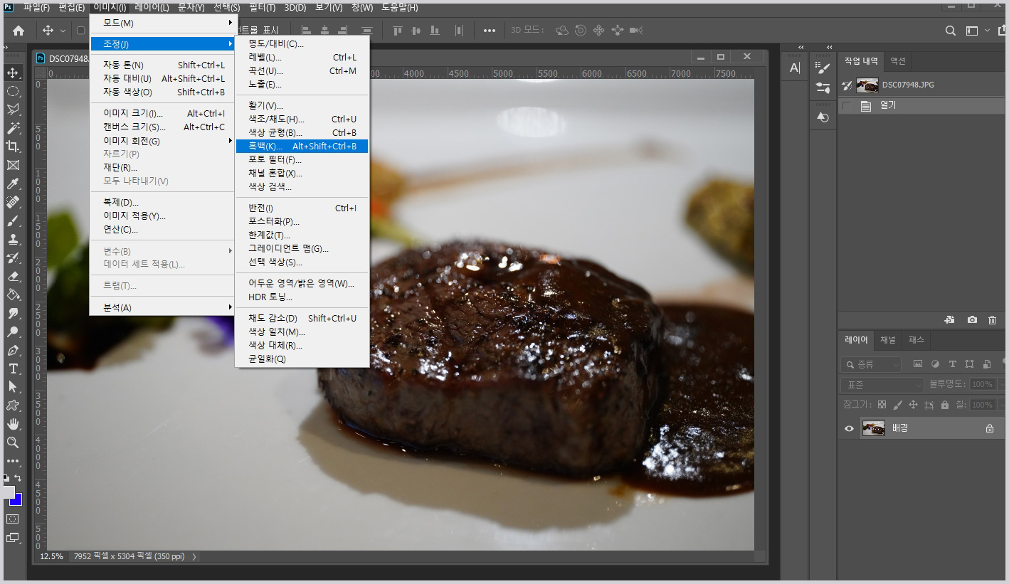 우선 이미지를 포토샵으로 불러와 줍니다. 저는 예전에 먹었던 스테이크 사진을 가지고 와봤습니다. 흑백으로 바꿔 보도록 하겠습니다.