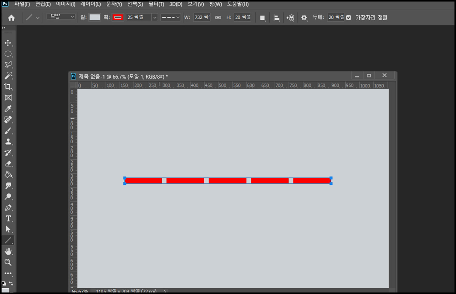 사각형 툴을 점선으로 그려 봤다면 이번에는 직선인데 점선으로 그려 봅시다. 위의 방법과 방법은 거의 같습니다. 사각형 도구 대신 '선 도구'를 선택하면 됩니다. 상단에서 점선으로 설정한 후에 선을 그리기만 하면 이미지와 같이 일직선이면서 점선인 선이 그려지게 됩니다.