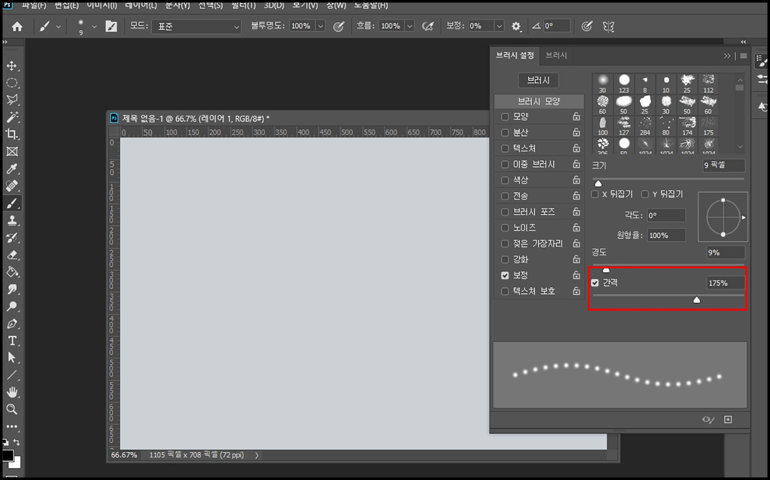 브러쉬 설정에 보시면 간격이라는 설정이 보이실 텐데요. 간격을 늘려준 후에 브러쉬로 선을 그리게 되면 연결된 선이 아닌 점선으로 그려지는 것을 확인하실 수 있습니다.