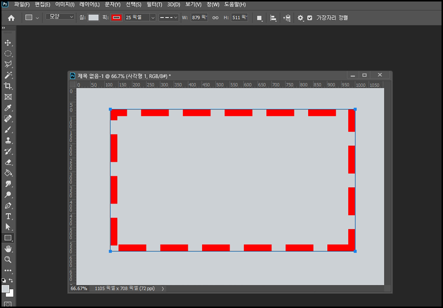 사각형 도구를 사용해서 사각형을 그리고 점선으로 설정을 하게 되면 다음과 같이 점선으로 사각형을 그릴 수 있습니다. 색상이나 크기 등 디테일한 설정이 가능하니 상단의 메뉴에서 수치를 조절해 보시길 바랍니다.