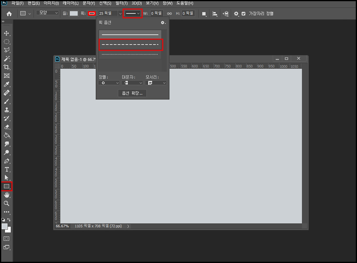 일단, 사각형에 점선을 넣어보도록 하겠습니다. 자유변형툴에서 사각형 도구를 선택하고,상단 메뉴에서 점선을 선택해 줍니다. 기타 크기는 픽셀의 수치로 설정해 주시면 되고, 칠을 끄게 되면 배경 없이 점선만 그려지게 됩니다.