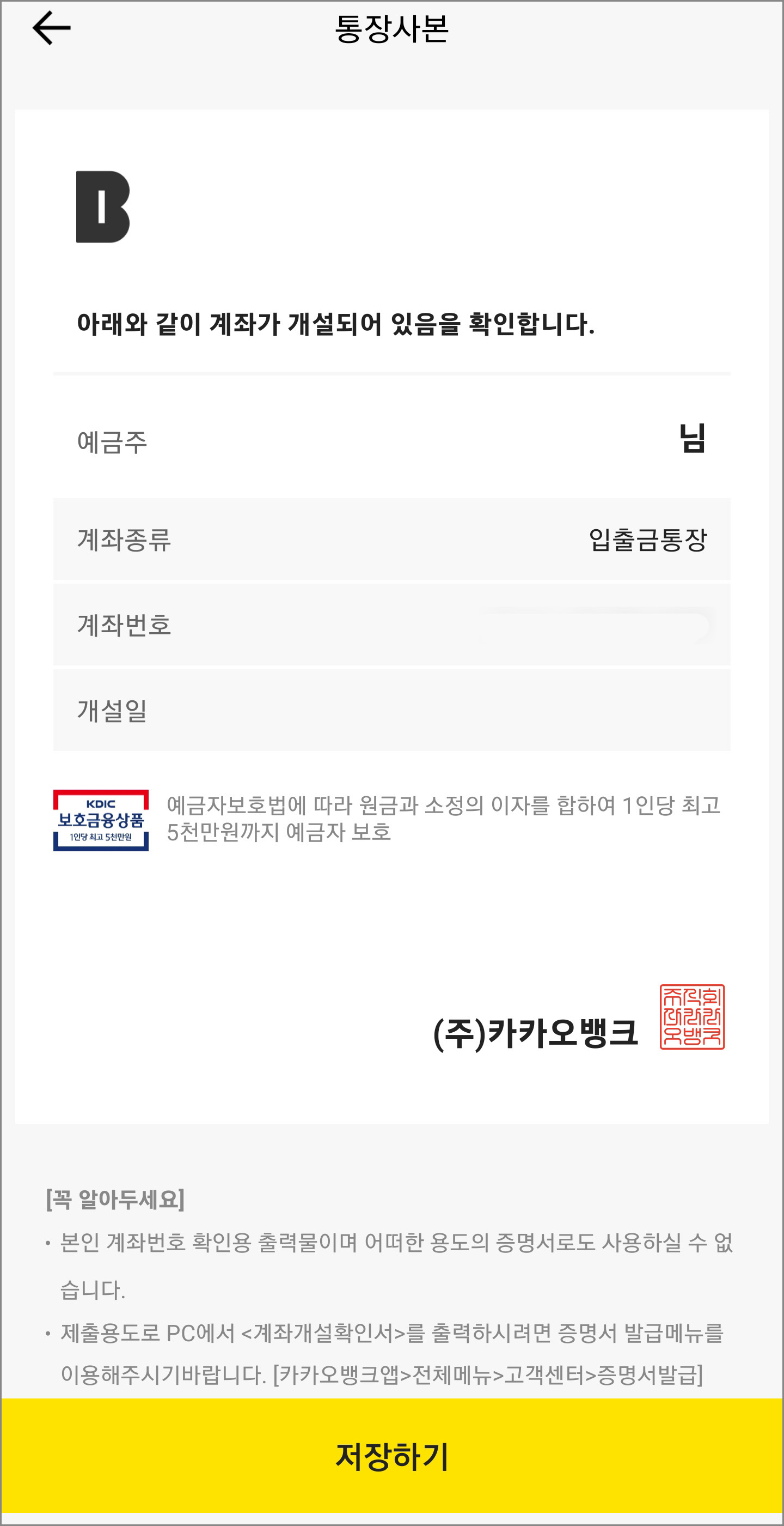 카카오뱅크 통장사본 확인 및 저장.