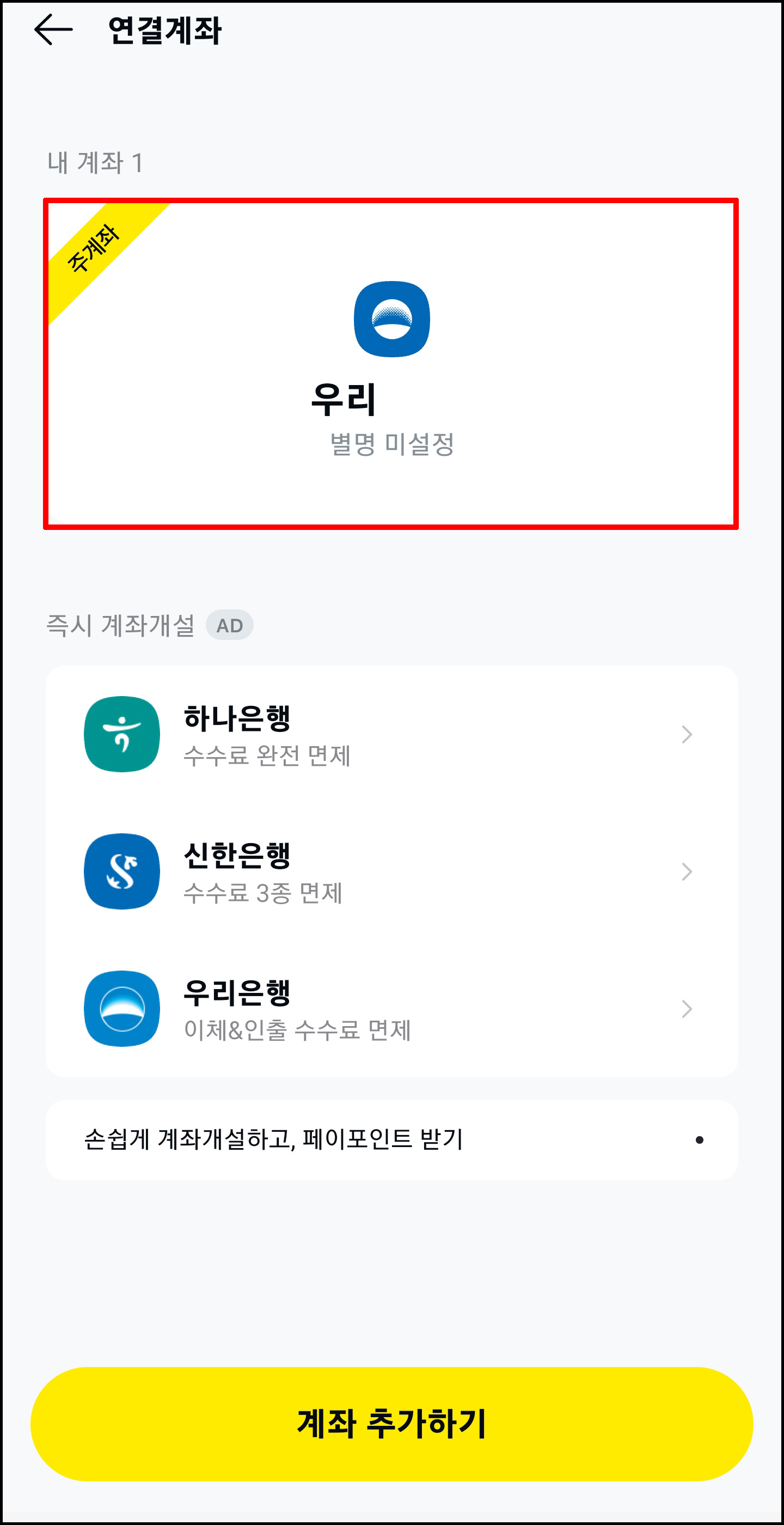 설정해 놓은 주계좌를 클릭합니다. 제일 상단에 위치하고 있으니 찾는건 어렵지 않으실거에요.