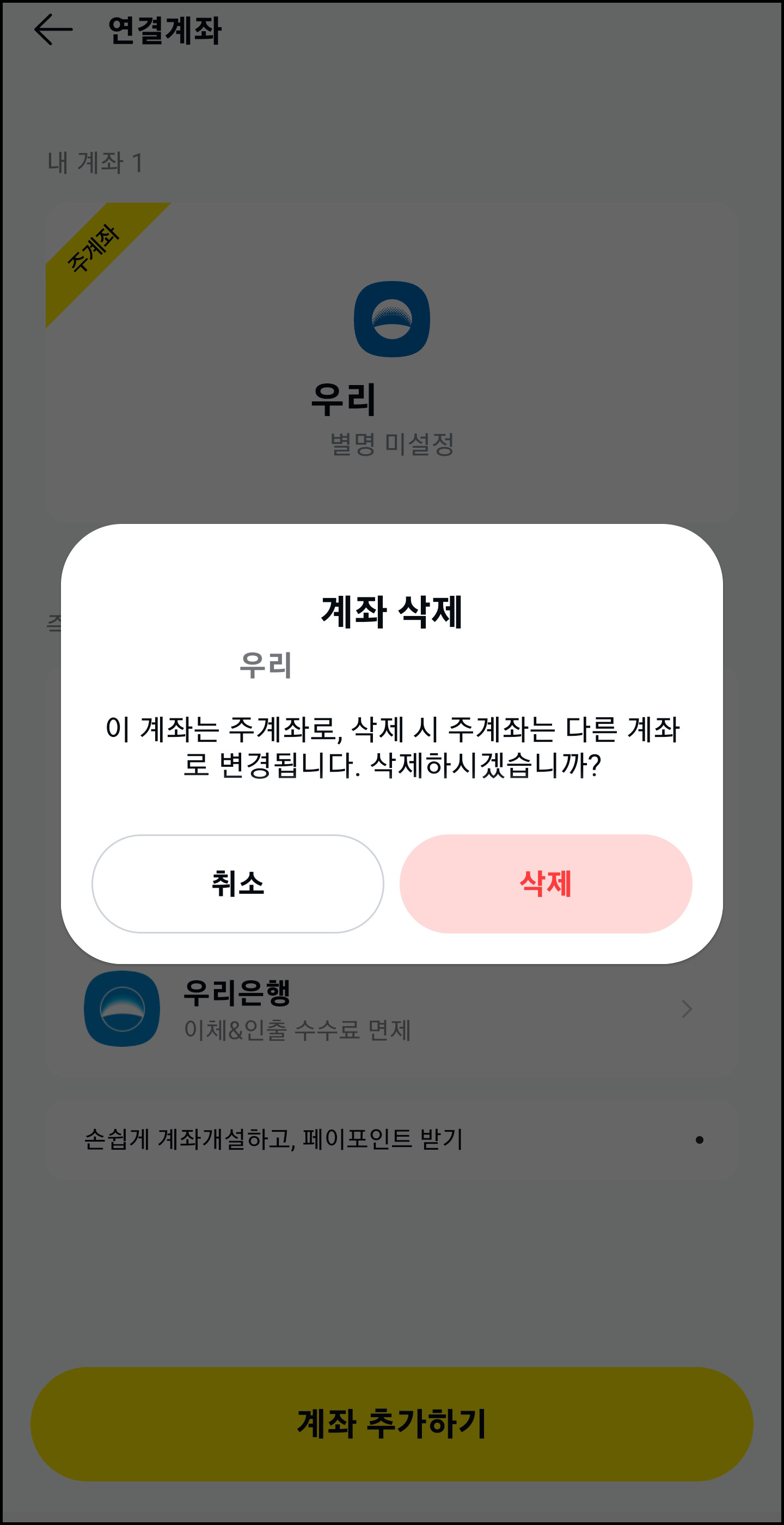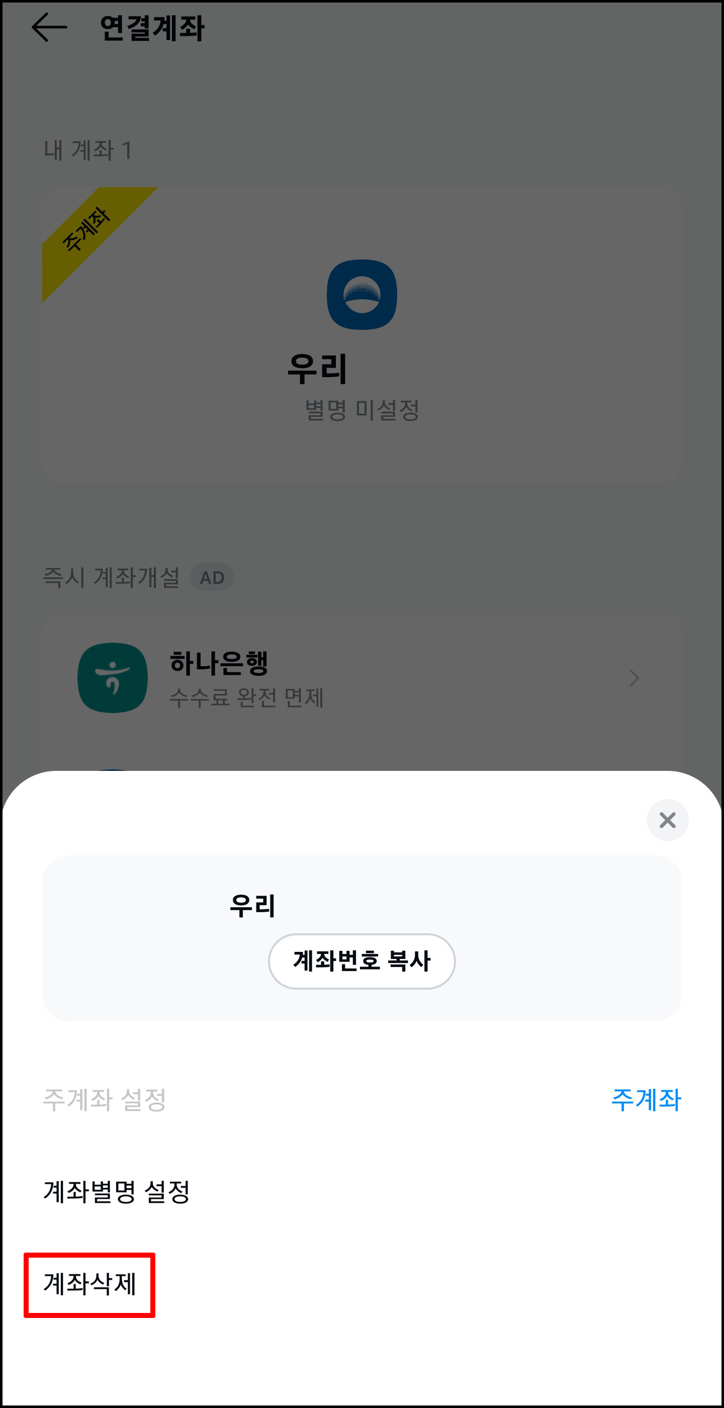 주계좌를 클릭하시면 '계좌삭제'가 메뉴가 보이실 거에요. 클릭하시면 됩니다.
