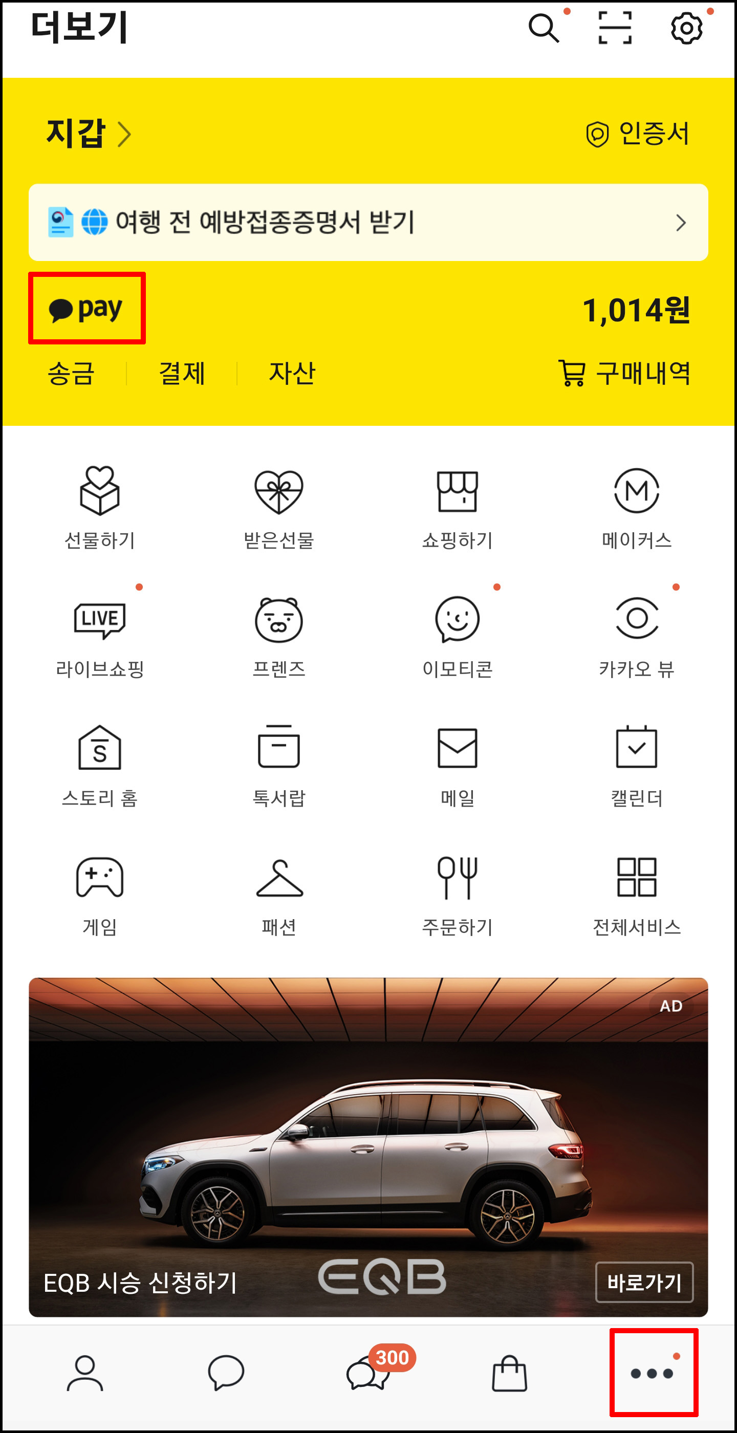 '카카오 앱 하단 점3개 클릭 > Pay 클릭' 점 3개를 클릭하면 여러가지 메뉴들이 나오는데요. 누르기만 하면 메인에 pay를 확인할 수 있습니다. Pay를 클릭합니다.