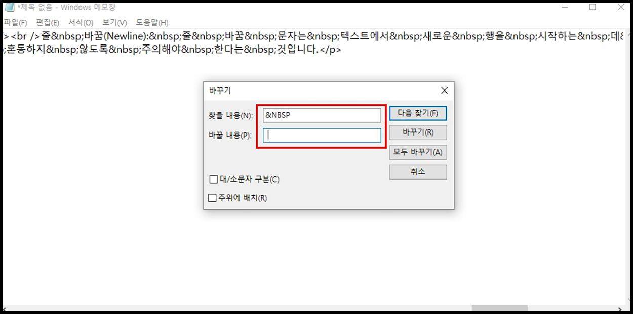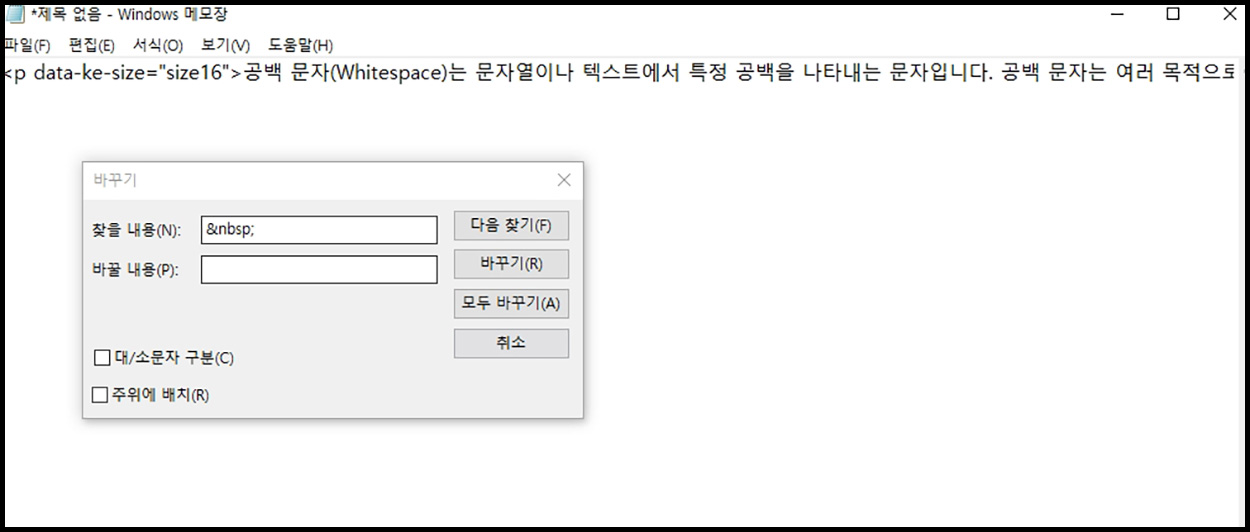 2. 바꿀 내용엔 스페이스 바 한 번을 칩니다.(한 칸을 띄우는 것 입니다.)