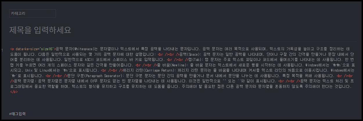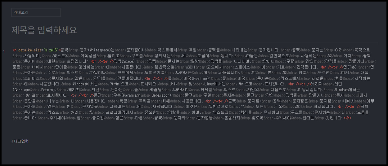 기본모드에서는 제대로 잘 들어간 것으로 보이지만, HTML 모드로 전환을 하면 공백 문자인  가 적용된 것을 확인할 수 있습니다.