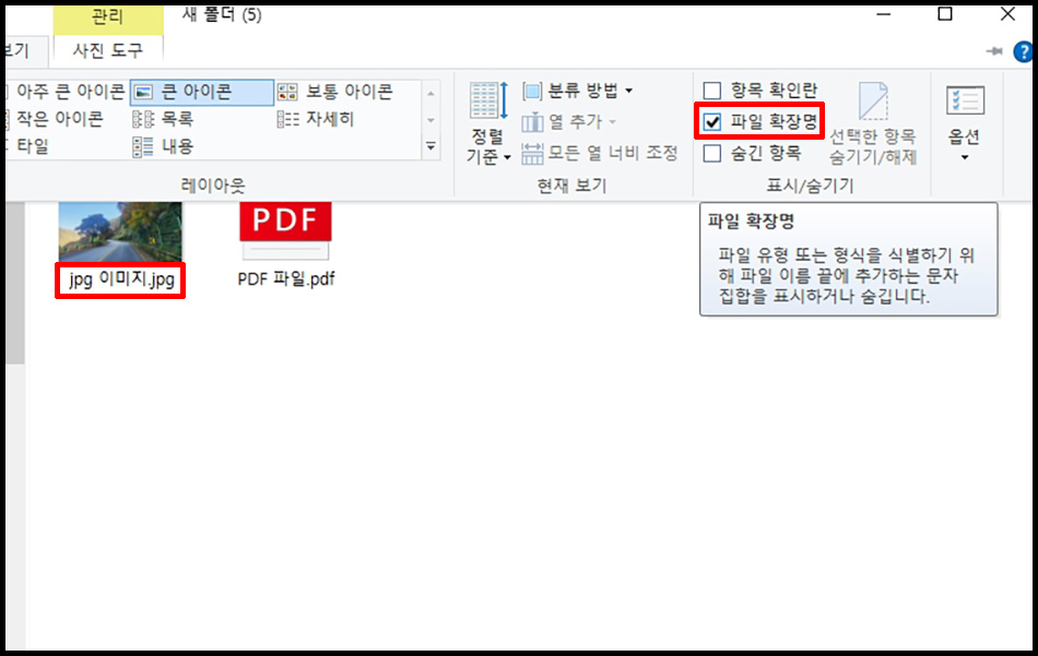 확장자를 임의로 변경하게 되면 파일이 깨지는 경우가 있기 때문에 보통파일 확장명이 숨겨져 있습니다. 옵션을 통해 켜주게 되면 파일 뒤에 '.jpg' 확장자가 보이게 됩니다.