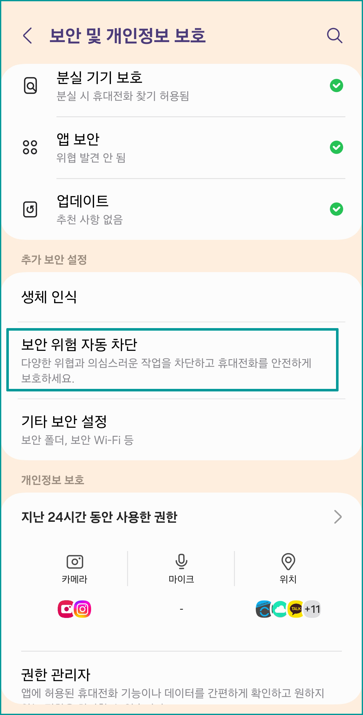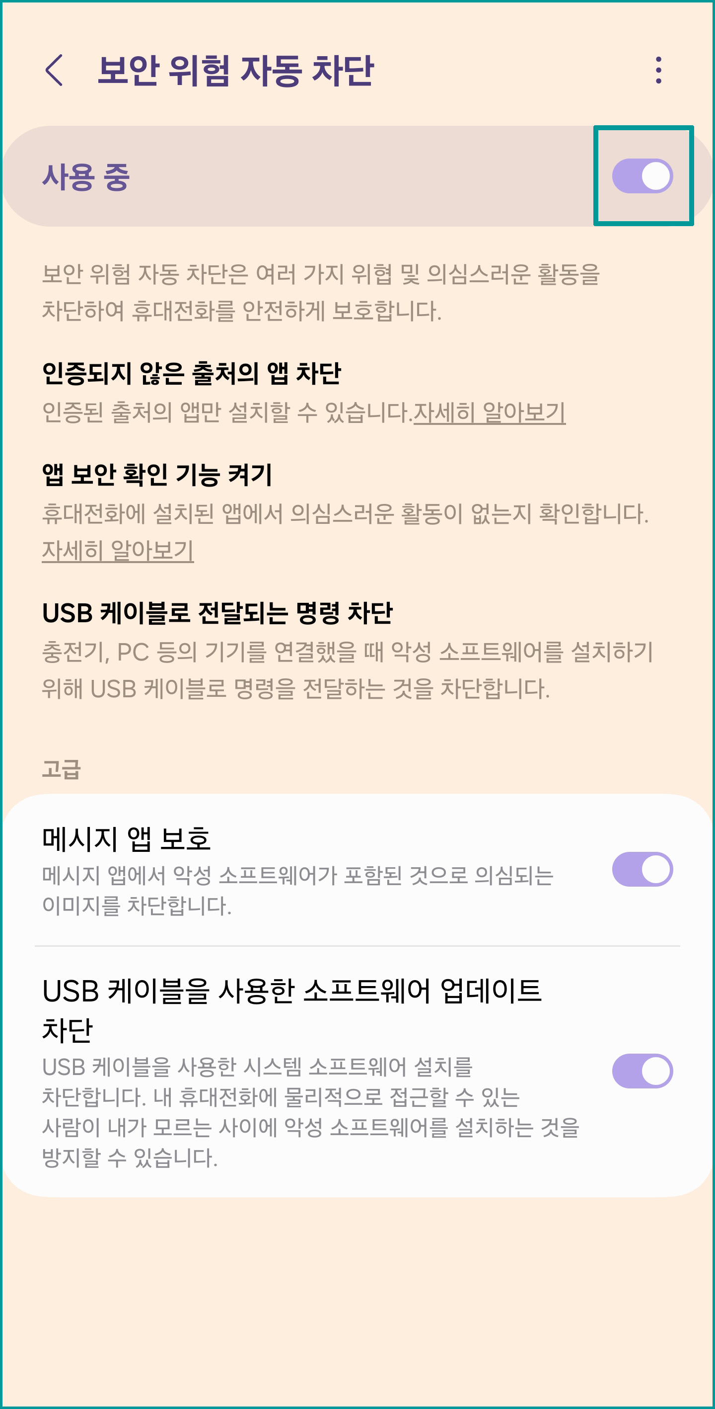설정 > 보안 및 개인정보 보호 > 보안 위험 자동 차단 > 사용 중