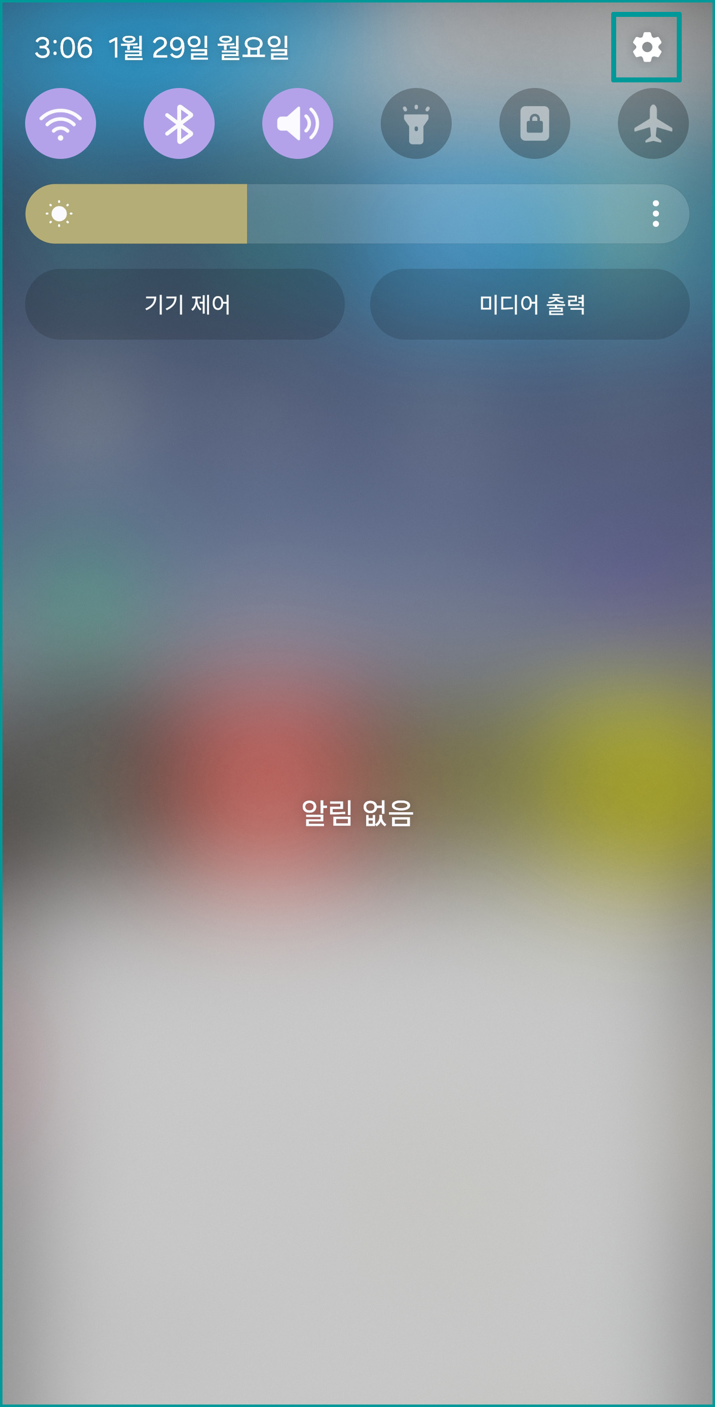 휴대폰을 위에서 아래로 쓸어 내리면 창이 하나 내려오면서 톱니바퀴 모양의 설정으로 들어갈 수 있는 아이콘이 보이실 건데요 클릭해 주세요.