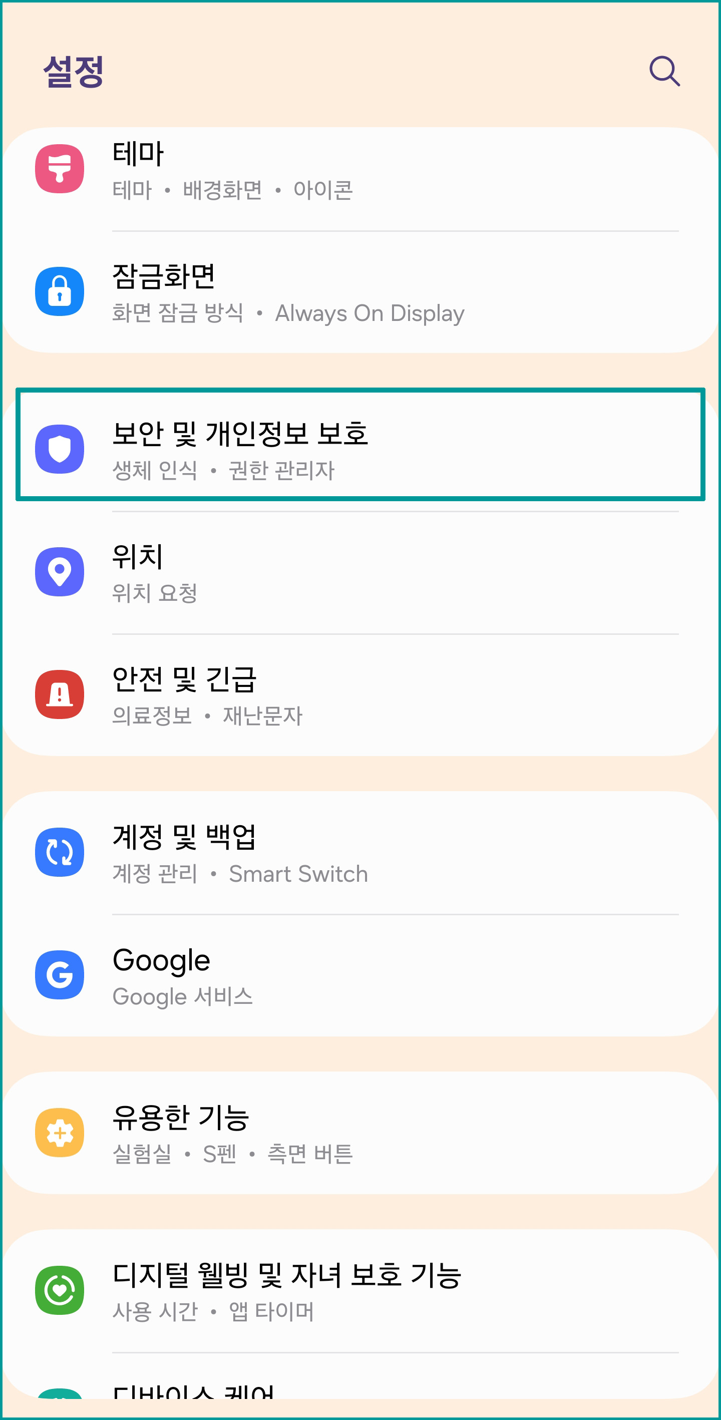 설정에 들어 오셨으면 보안 및 개인정보 보호 메뉴를 클릭해 주세요.