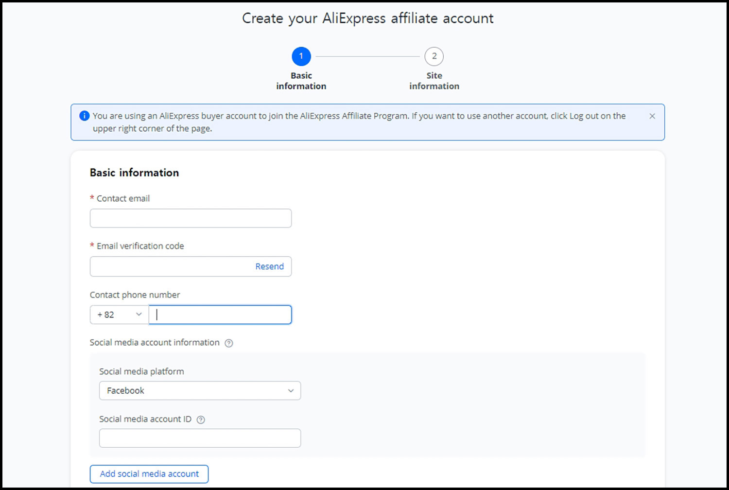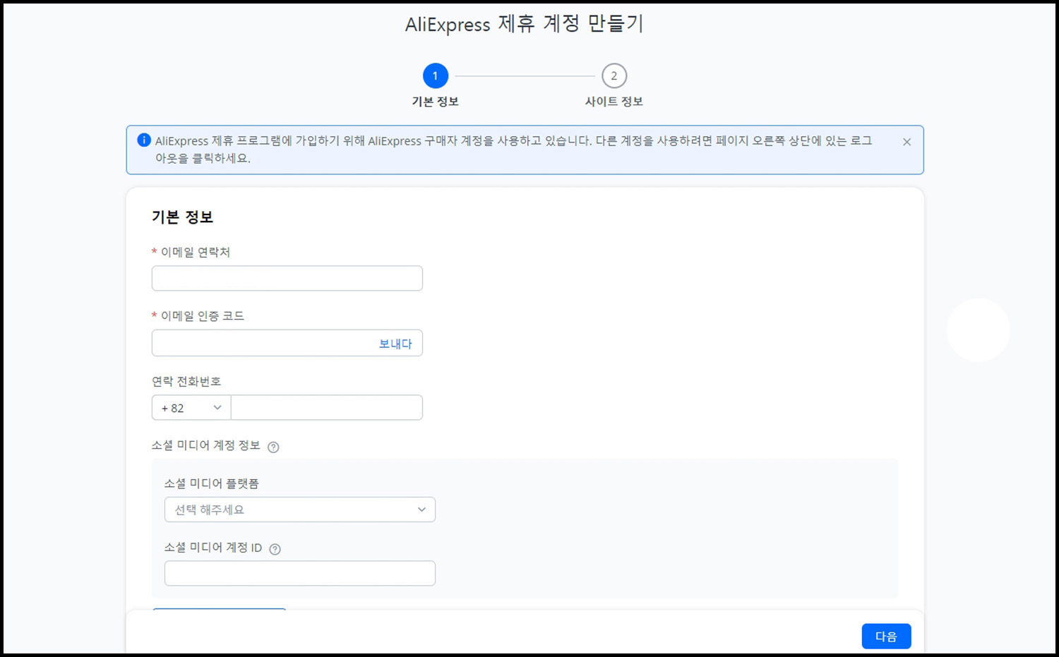 기본 가입 외 제휴 계정 만들기 과정을 통해 정보를 기입 및 제출하고 심사를 받으면 됩니다. 내용은 이메일, 연락처, 알리익스프레스 어필리에이트 활동 시 사용하게 될 SNS 정보 등입니다.
