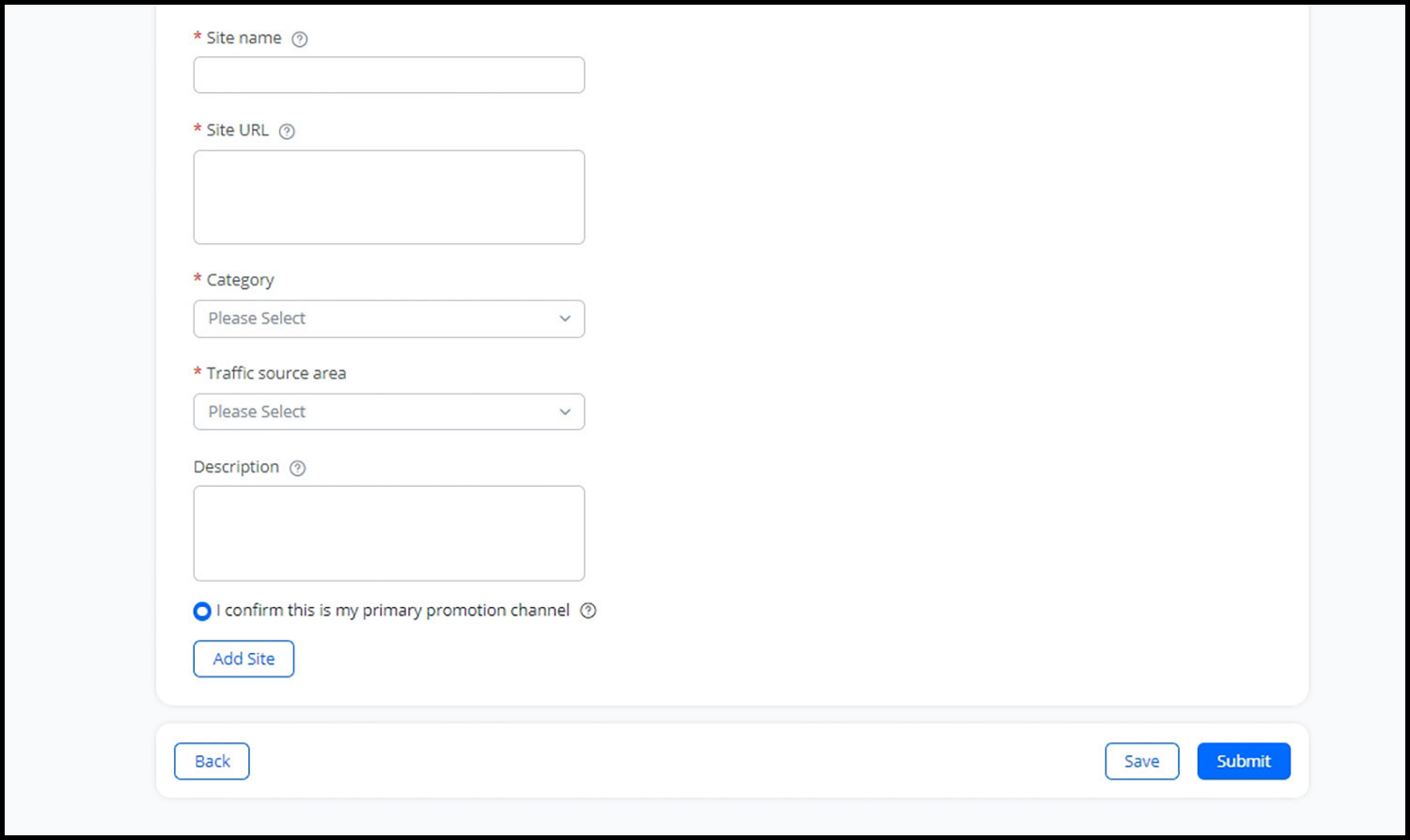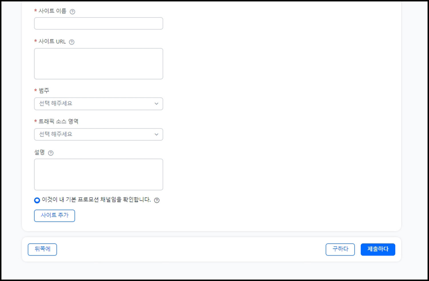자체 홍보 채널인지 아닌지를 선택하고 사이트의 이름과 Url을 적으면 됩니다. 활동 하는 SNS 이름과 URL을 적으면 되고, 회사 차원의 활동이 아닌 개인 홍보 채널을 이용한다면 비네트워크로 선택하면 됩니다.