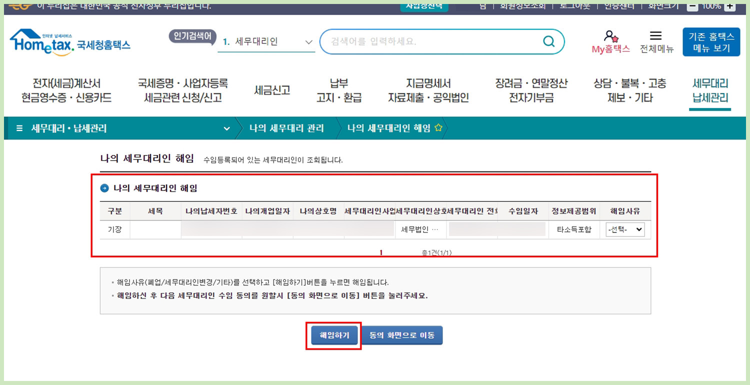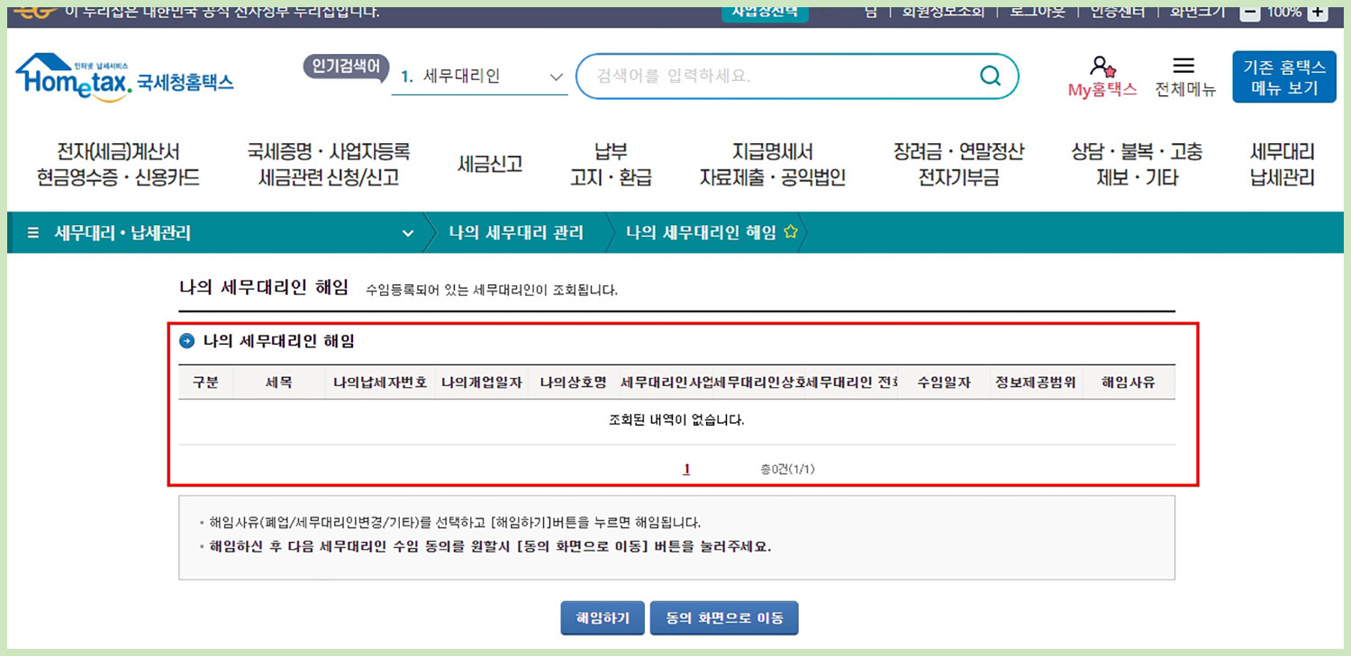 해당 메뉴에 들어가보니 나의 세무대리인 해임에 현재 세무대리인으로 한 세무법인이 올라가 있네요. 해임하기 버튼을 눌러서 정리해 주었습니다.