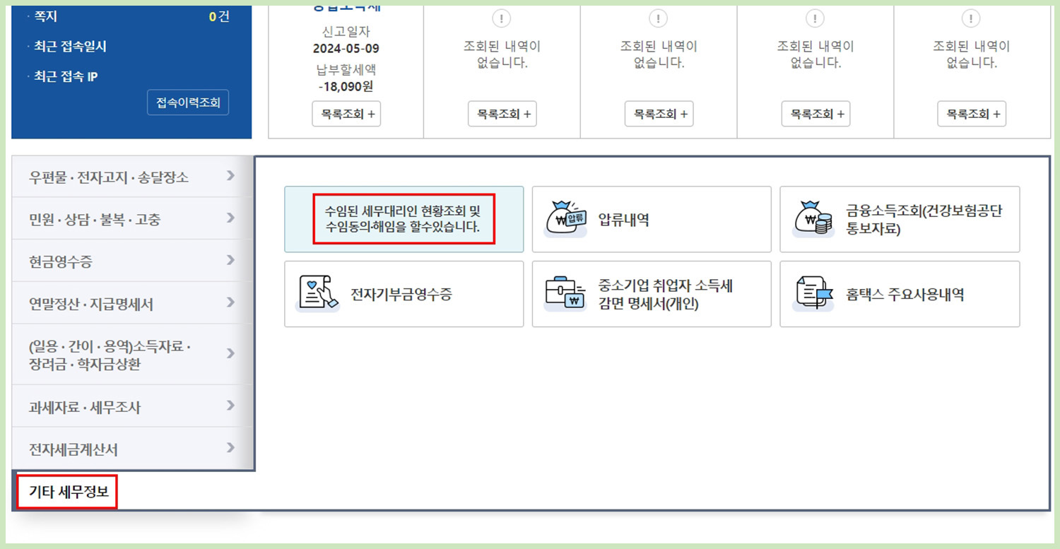 My홈택스 > 기타 세무정보 > 수임된 세무대리인 현황조회 및 수임동의·해임을 할수있습니다.