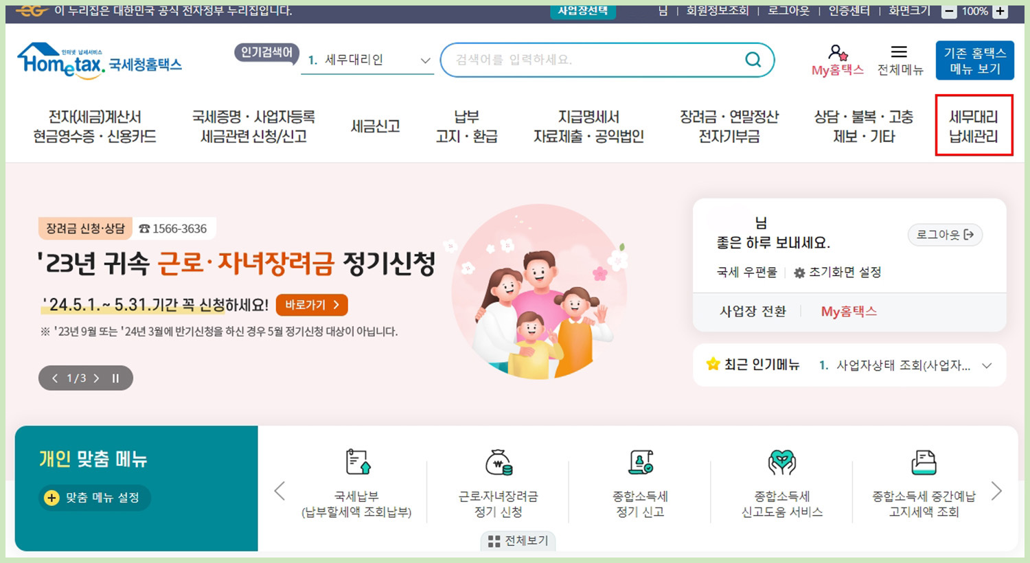 삼쩜삼 등 세무대리 앱 등을 통해서 신고 대리 업무를 맡기게 되면 편리하지만, 나의 정보를 그대로 연람할 수 있기 때문에 개인 정보 유출이나 다른쪽으로 활용할 수 있다는 불안감 때문인데요. 해당 부분이 걱정 되신다면 국세청 홈택스에 접속하셔서 세무대리인 확인 및 해임을 진행할 수 있습니다.