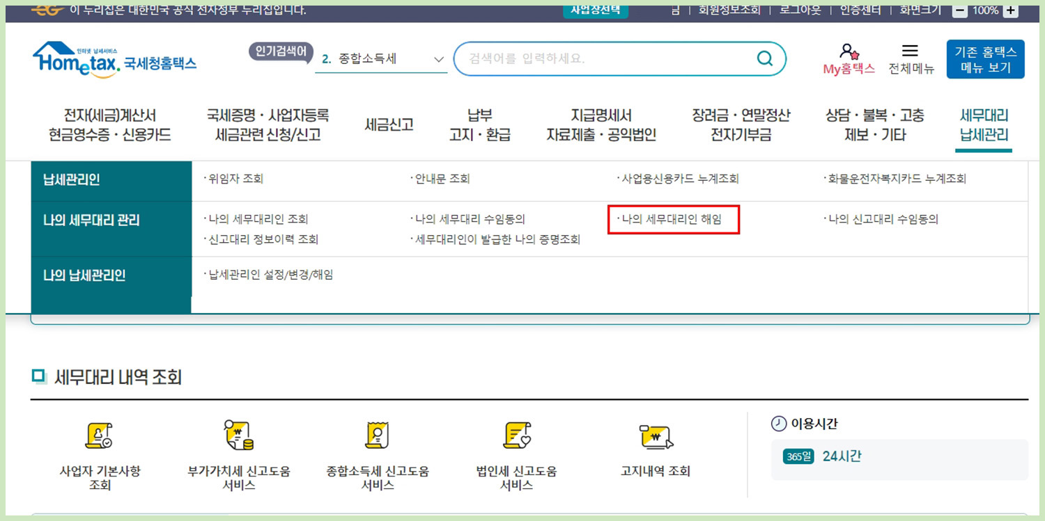 국세청 홈택스 접속 > 로그인 > 세무대리 납세관리 > 나의 세무대리 관리 > 나의 세무대리인 해임