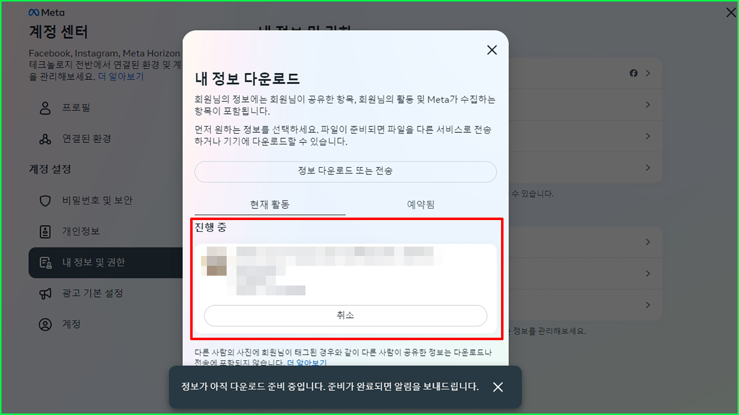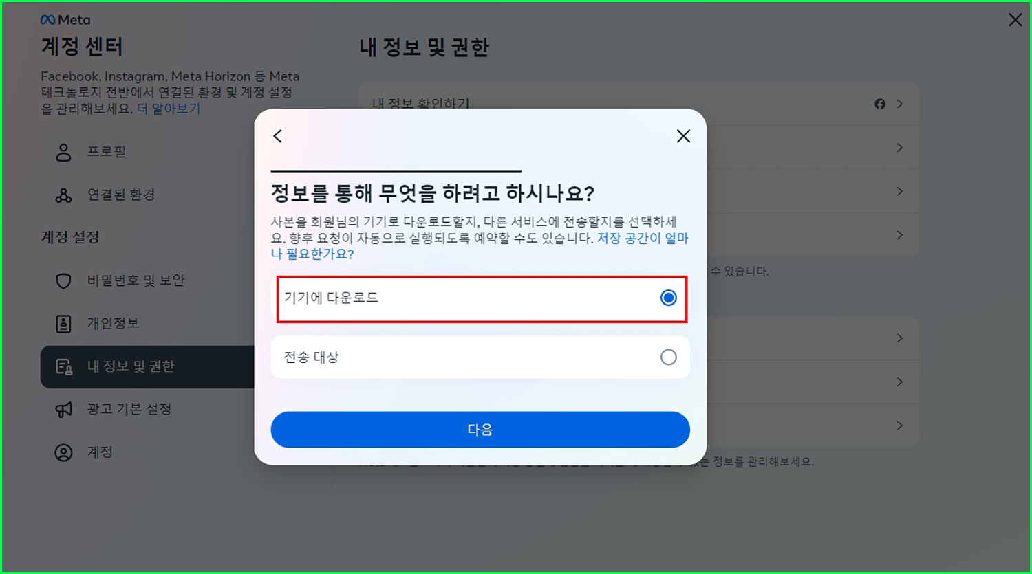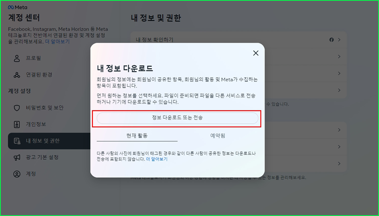 위 과정대로 진행하셨다면 내 정보 다운로드 창이 뜨면서 다운로드가 진행됩니다. 이때 데이터를 정리하는 시간이 필요함으로 바로는 않되고, 약 10분 정도 기다리면 완료됩니다. 시간이 지나도 다운로드 버튼이 보이질 않는다면 원점으로 돌아간 뒤에 위 과정대로 클릭만 해줘서 '내 정보 다운로드' 창으로 다시 돌아오면 확인하실 수 있습니다.(일종의 새로고침 느낌)