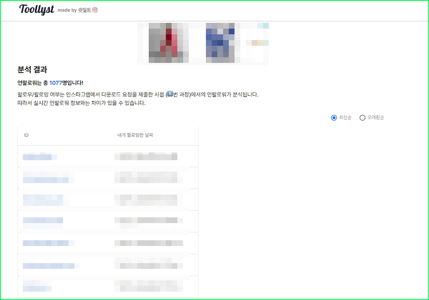 최신순, 오래된순으로 정리도 가능합니다. 바로 언팔한 사람들의 아이디를 누르게 되면 인스타그램으로 바로 연동되어 바로 언팔을 진행할 수 있습니다.