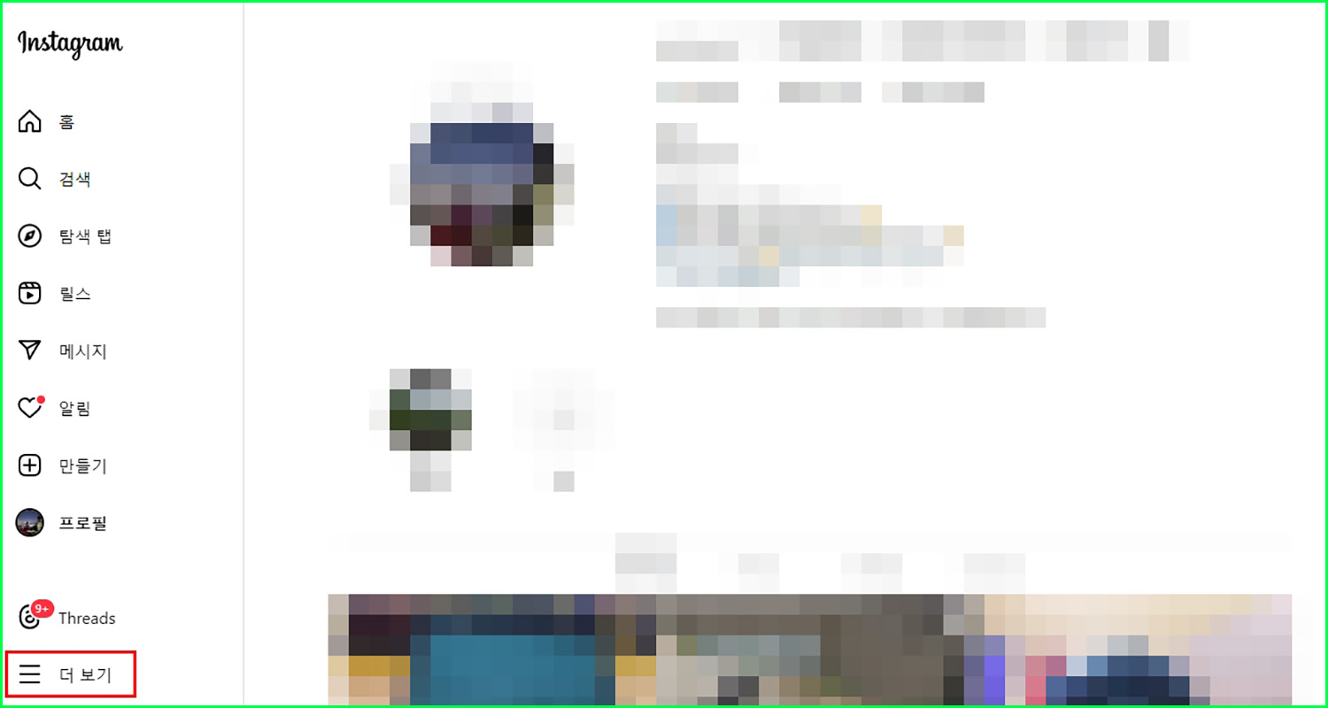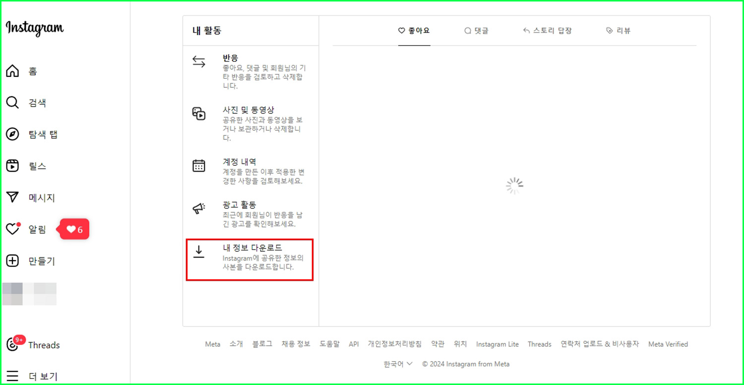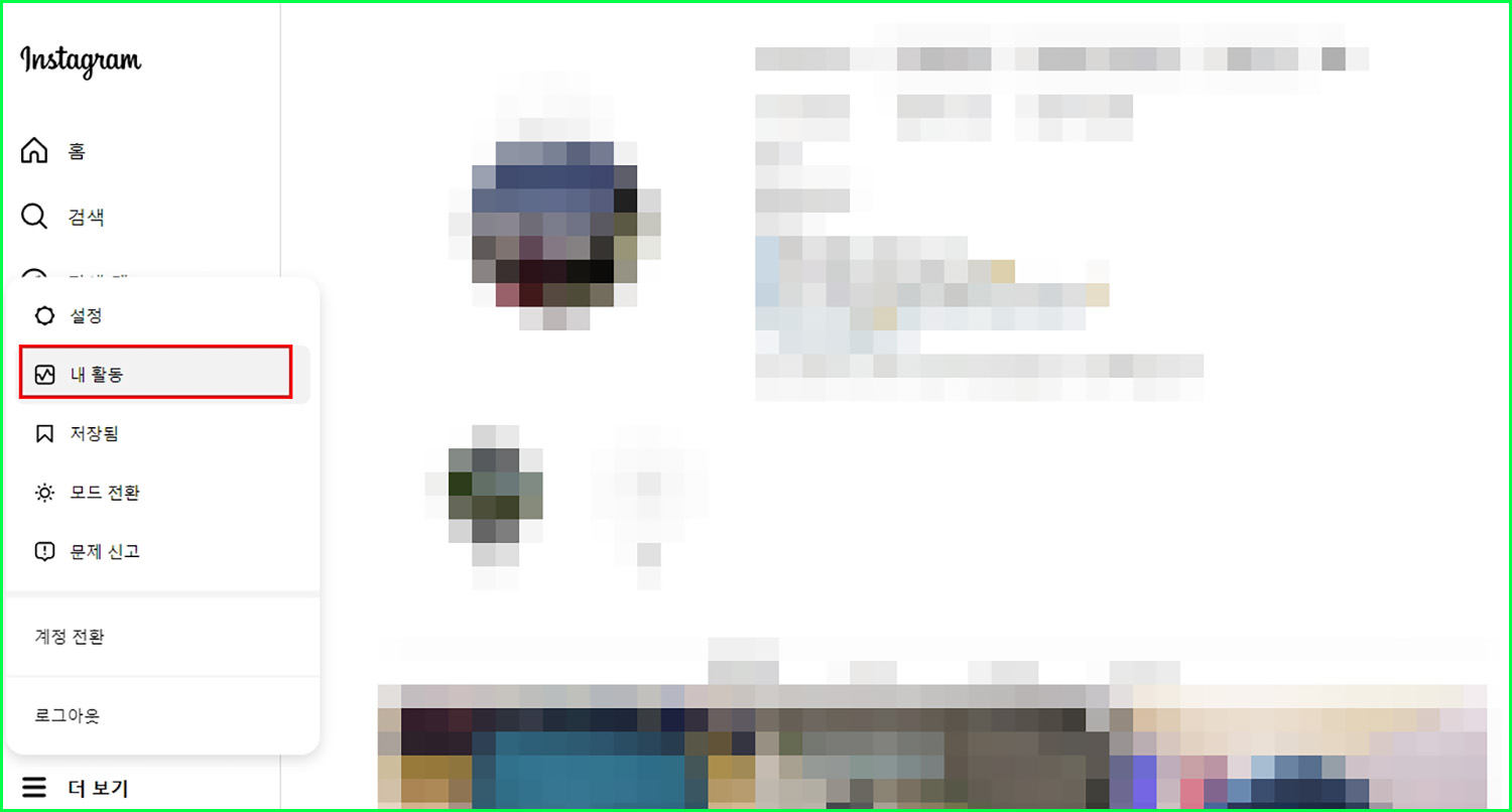 인스타그램 PC버전 > 좌측 하단 '더보기' 클릭 > 내 활동