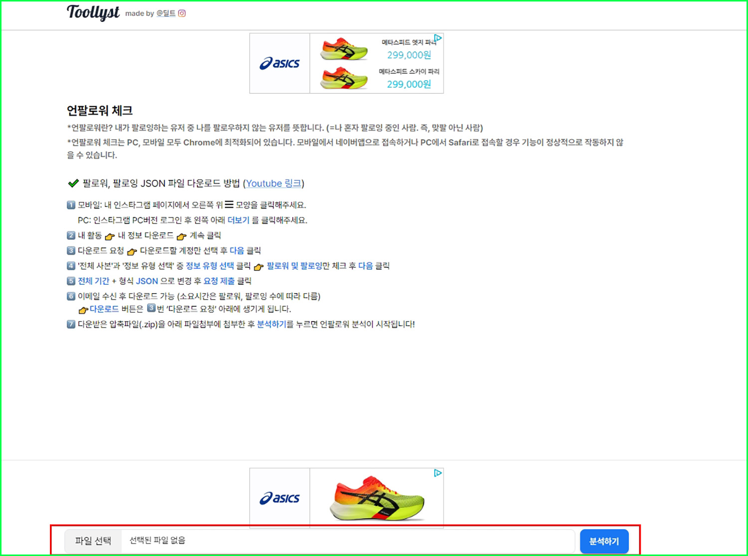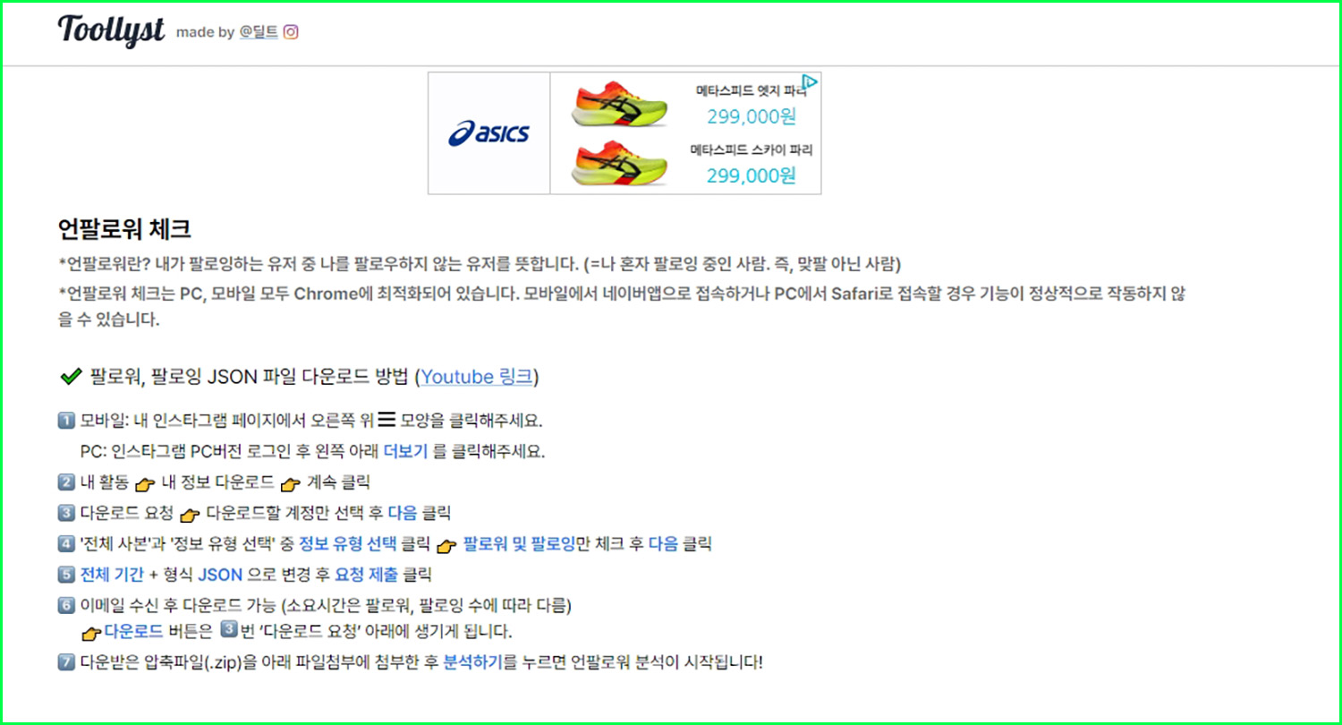 데이터 파일을 만든 후 분석이 필요합니다. 분석을 위해서는 'toollyst' 사이트에 접속을 해야 합니다. 아래 과정대로 파일을 만드시고, 해당 사이트를 통해 언팔로우를 확인하시길 바랍니다.