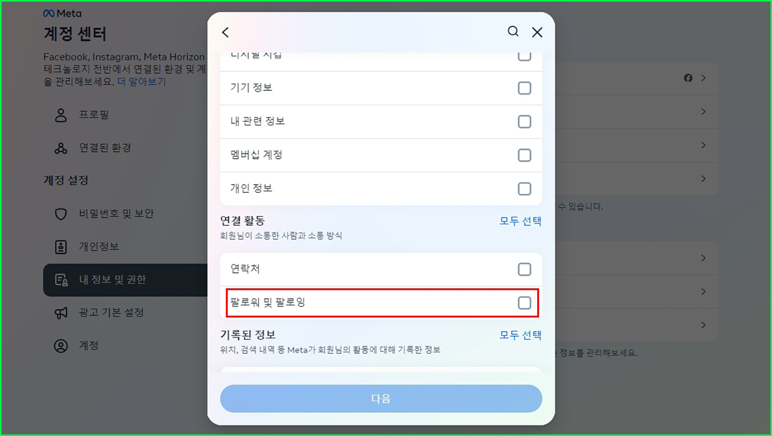인스타를 통해서 여러가지 정보를 다운로드 받을 수 있는데, 이중에서 원하는 것만 선택합니다. 여러가지를 선택하게 되면 원하지 않는 데이터까지 받게 되어서 시간이 오래 걸립니다. 여기서 원하는 것은 팔로워 및 팔로잉 데이터이니 선택해 줍니다.