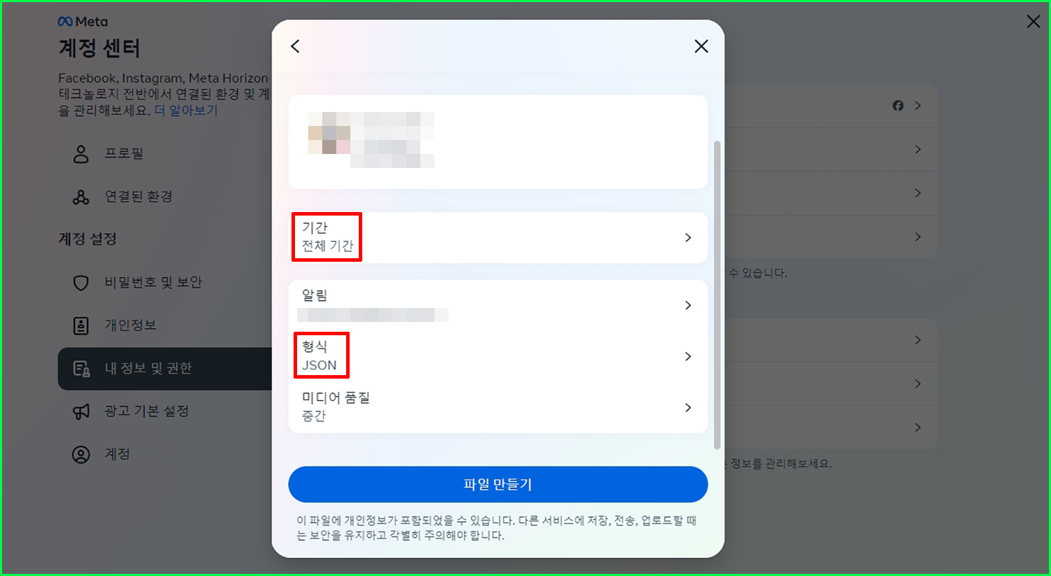 > 일부정보 > 팔로워 및 팔로잉 > 기기에 다운로드 > 기간 : 전체 기간 > 형식 JSON