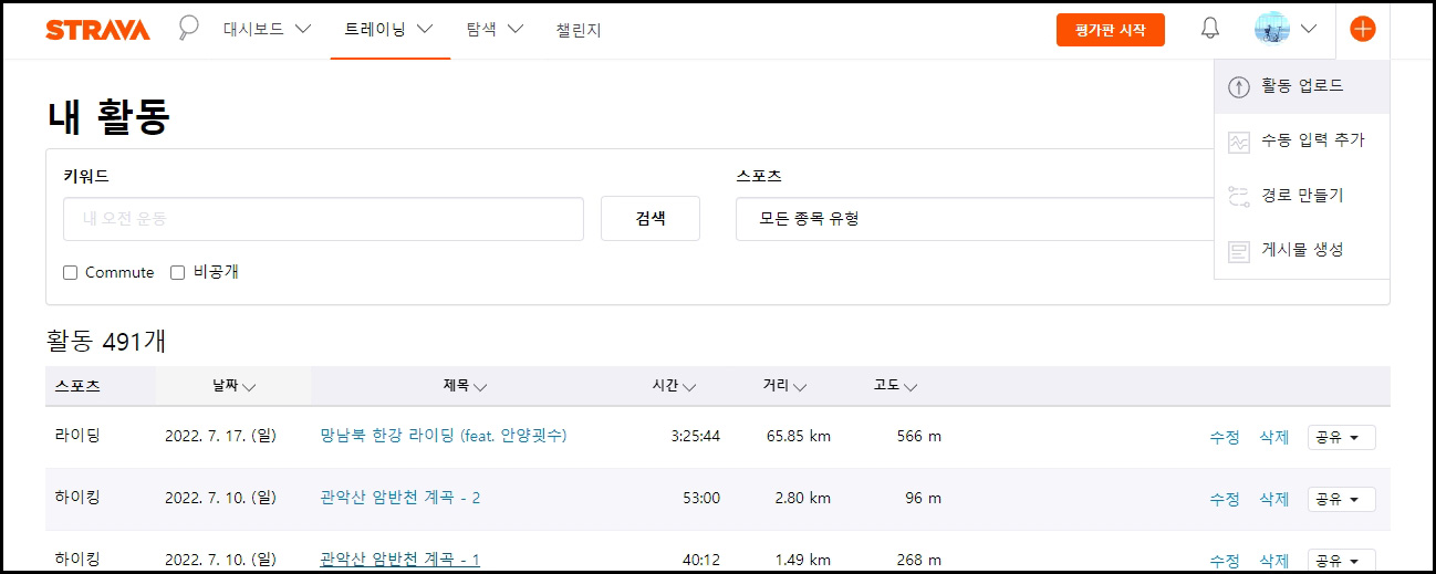 - PC로 스트라바에 접속하여 좌측 상단 프로필을 누르면 활동 업로드 메뉴가 보입니다.
