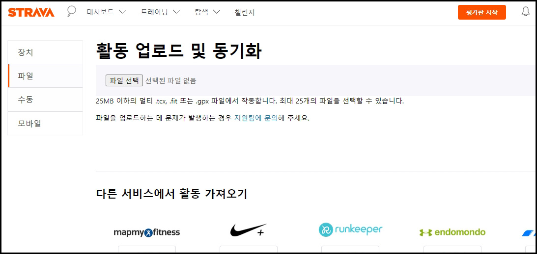 - 활동 업로드를 클릭하면 좌측에 메뉴가 보이는데, 파일을 누르고 파일선택 버튼을 누르거나 드래그 하여 GPX 파일을 넣으면 됩니다.