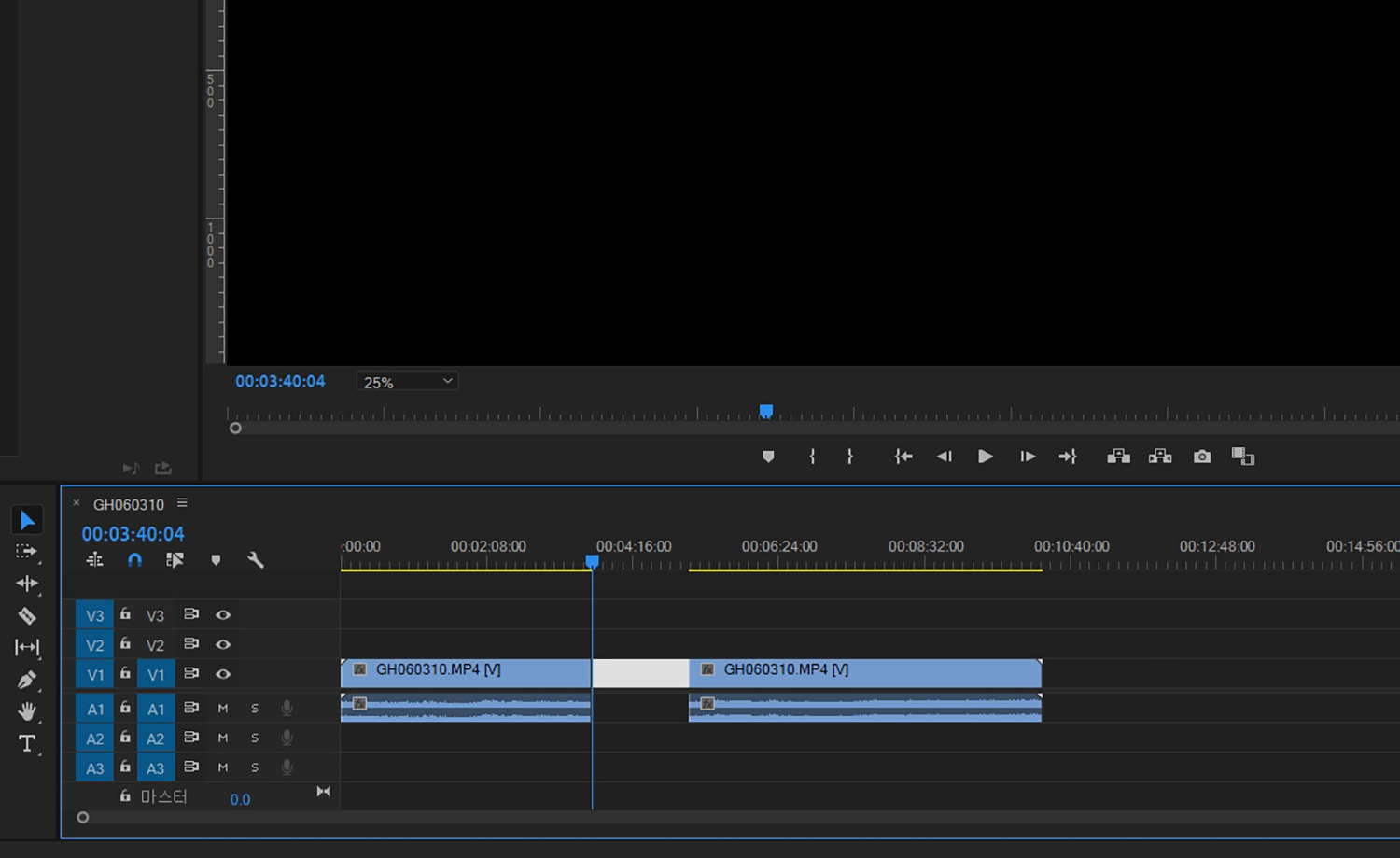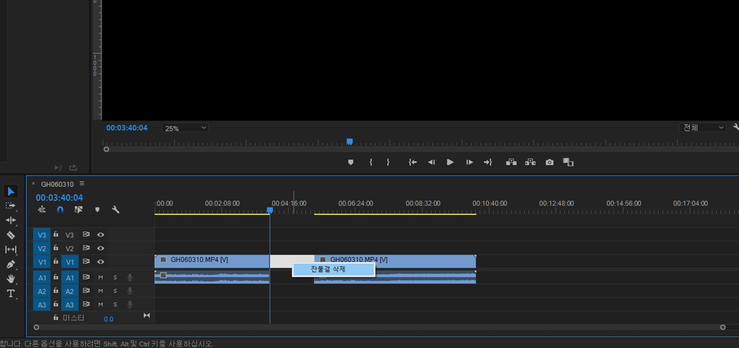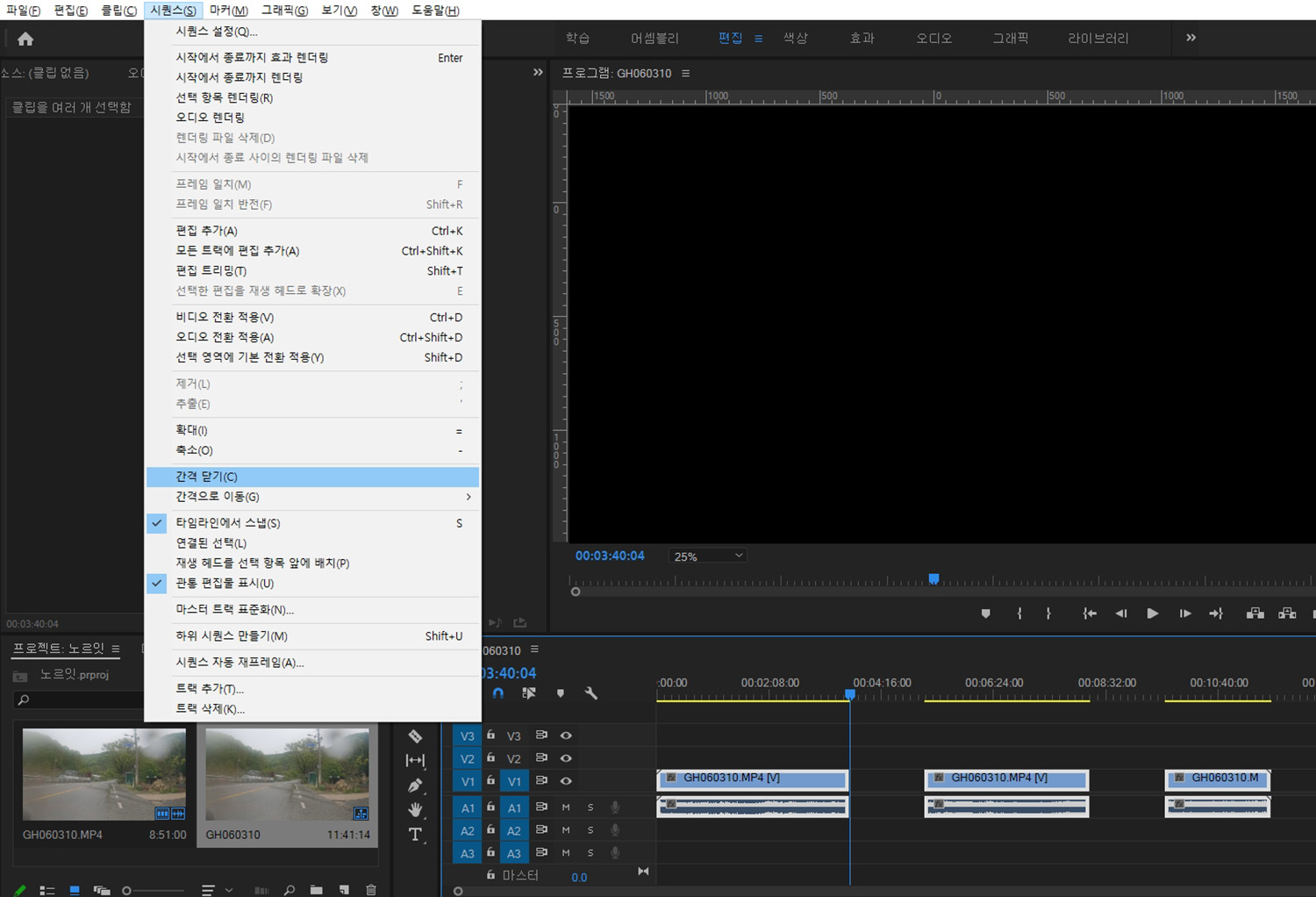 상단 메뉴에서 시퀸스 - 간격 닫기를 클릭해 주면 한 번에 모든 간격(공백)이 사라집니다.