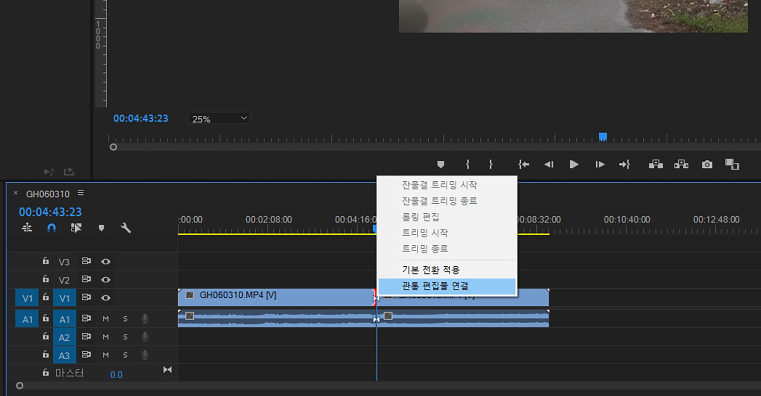 2. 잘린 클립 > 오른쪽 마우스 클릭 > 관통 편집물 연결