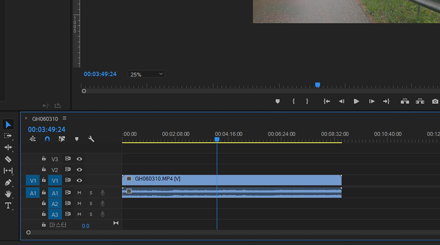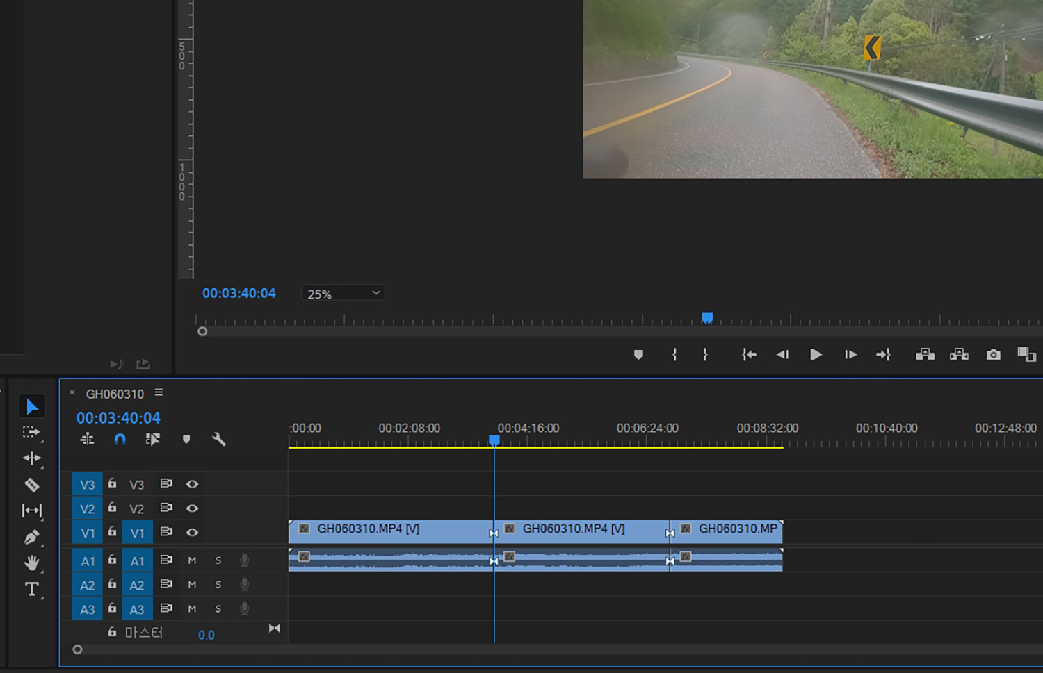 보통 동영상 파일을 프리미어에서 불러오면 영상 클립과 음성 클립 두 줄이 생깁니다. 이때 원하는 부분만 자르고자 한다면 클립을 선택한 후에 도구에서 면도칼 모양을 선택(단축키 : C)를 선택해서 원하는 부분을 클릭해 주거나 컨트롤 + K 단축키를 실행해서 바로 잘라줄 수도 있습니다.