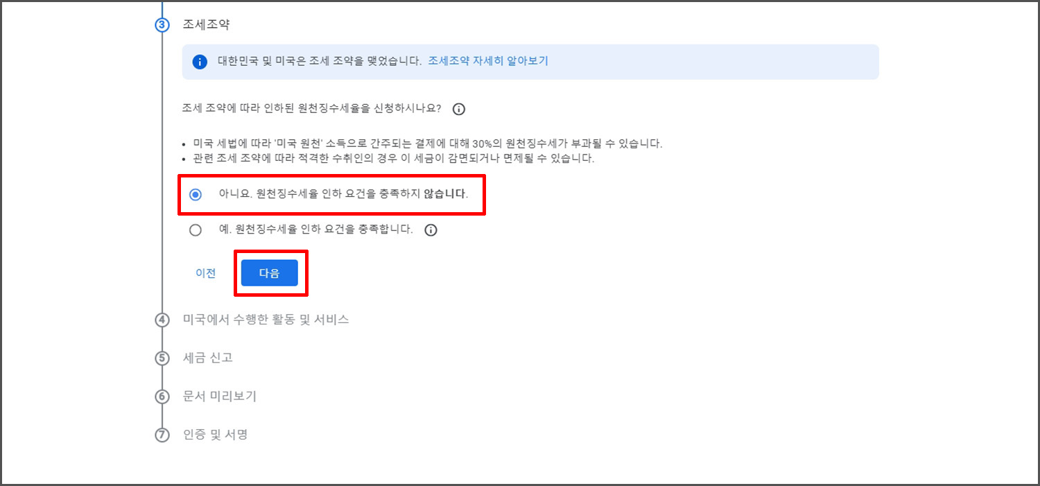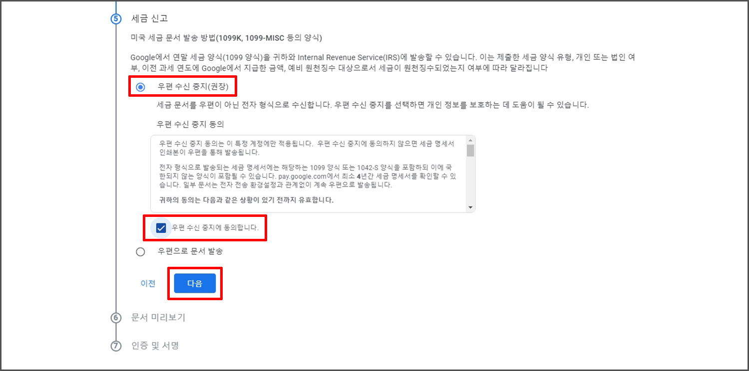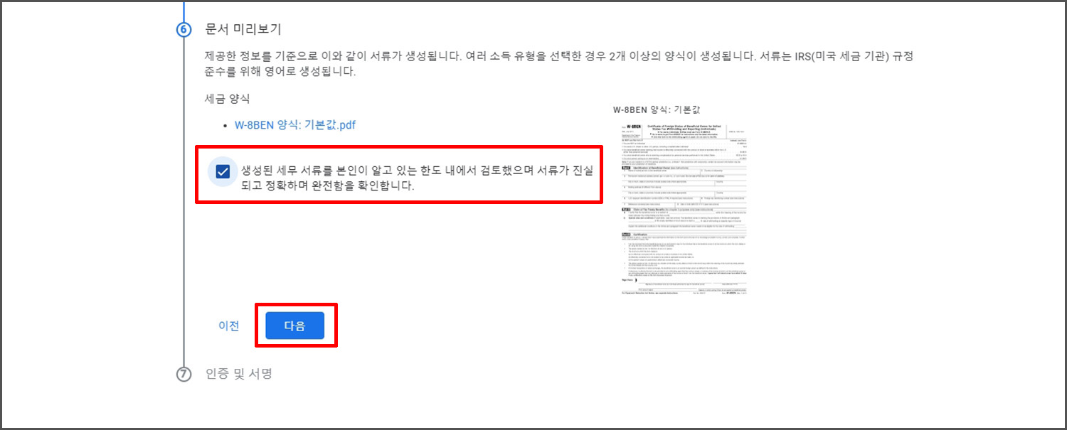 세무 서류를 확인하고 검토했는지 여부를 물어 봅니다. 우측의 이미지를 클릭해서 내용을 확인해 보실 수 있는데, 모두 영문입니다. 확인이 완료 되었다면 다음을 클릭합니다.