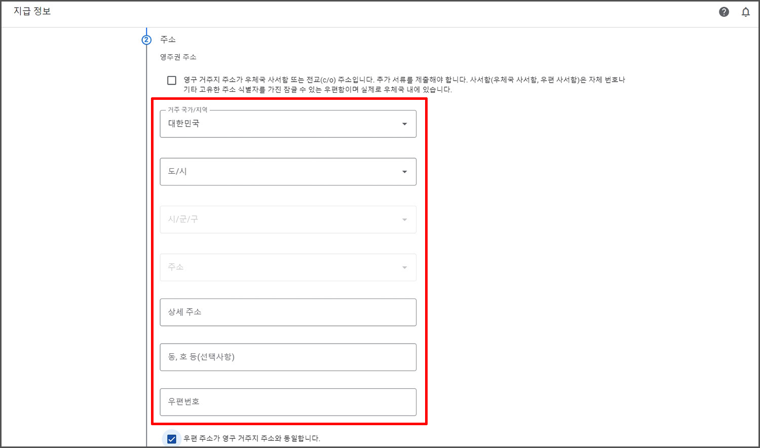 거주 중인 국가와 주소를 입력해 줍니다. 어려운 것은 없고 주소를 기입하면 됩니다. 다만, 영문으로 기입해야 합니다. 영문 주소를 모를 시에는 주소를 한글로 적고 뒤에 영어로라고 적어서 네이버 등에서 검색하시면 영문 주소로 바꿔서 보여줍니다.