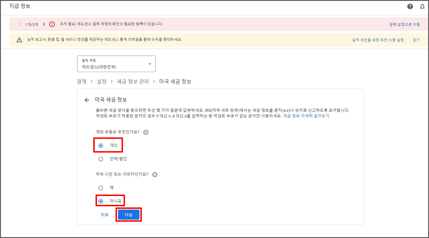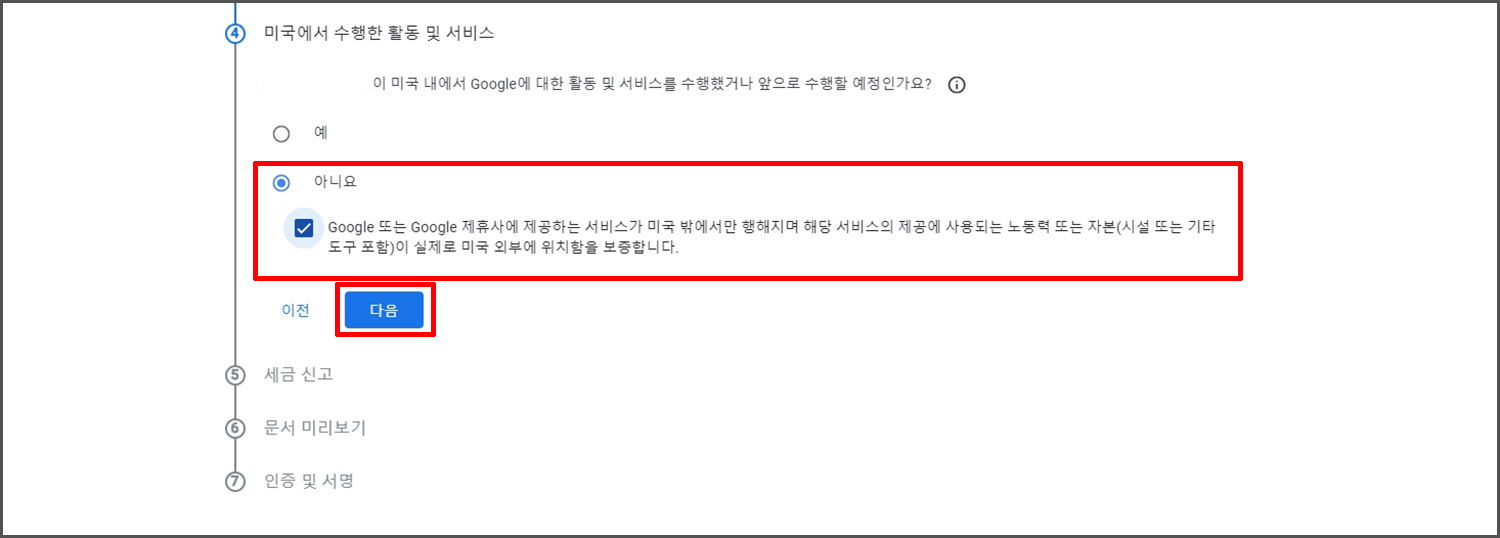 미국 내에서 구글을 통해서 수익 활동을 하고 있냐고 물어보는데 대한민국에서 진행함으로 아니요를 선택합니다.