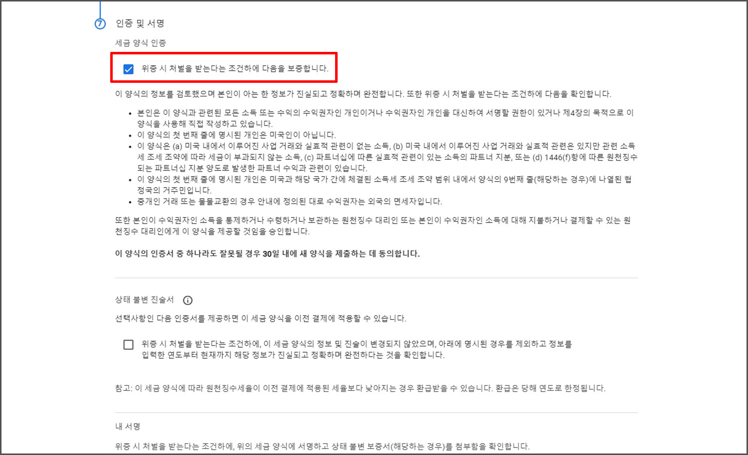 거짓 없이 인증하고 서명한 것이냐를 물어 봅니다. 당연히 보증한다를 체크하고 다음으로 넘어 갑니다. 상태 불변 진술서는 체크 하지 않아도 넘어갈 수 있습니다.(선택 사항)