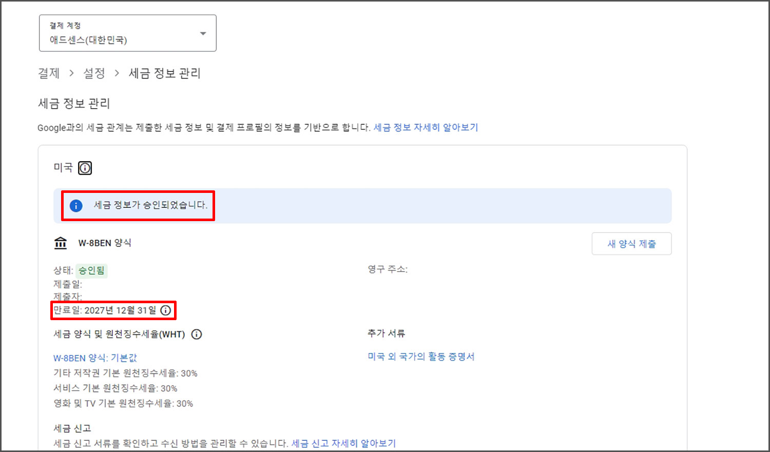 모든 세금 정보를 제대로 기입해서 제출 했다면 바로 승인이 납니다. 미국법상 3년에 한 번씩 제출하게 되어 있음으로 27년까지 유효합니다. 만약 세금ID 등을 잘못 기재해서 관련 문서를 요구한다면 영문 이름을 잘못 적은 것은 아닌지 확인해 보시고, 다시 처음부터 진행하시면 따로 서류를 제출하지 않으셔도 됩니다. 사용했던 세금ID는 구글 애드센스 내에서 확인이 가능합니다.