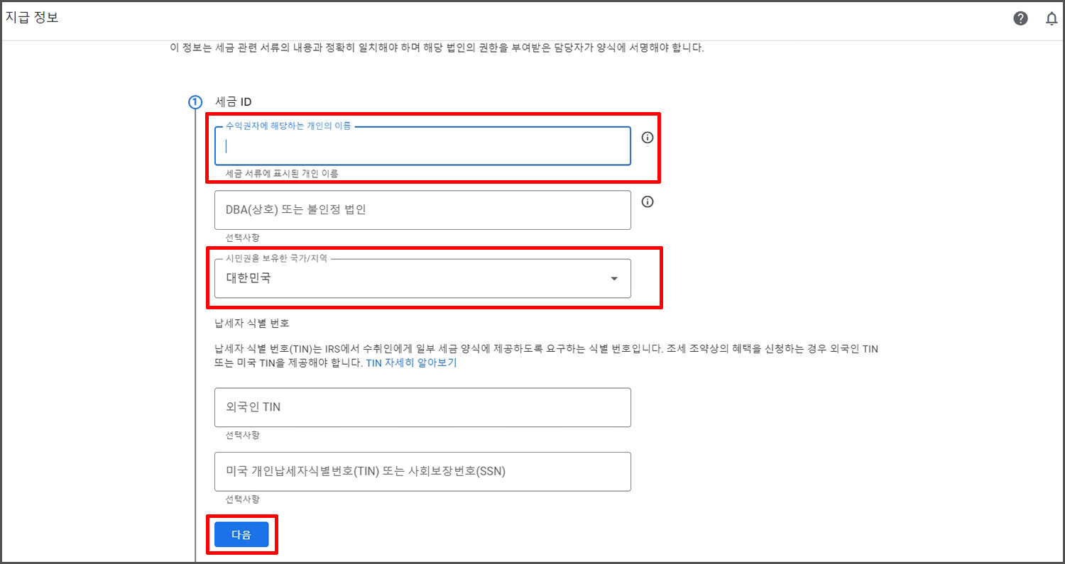 세금 ID는 본인의 영문 이름입니다. 기존에 애드센스에 기입했던 세금 정보와 반드시 일치해야 합니다. 이름이 달라지게 되면 여권이나 민증 등의 서류를 보내 확인하는 절차를 거쳐야 합니다. 띄어쓰기나 위치 등 완전히 똑같이 적어야 오류가 생기지 않습니다. 국가는 당연히 대한민국으로 해줍니다.