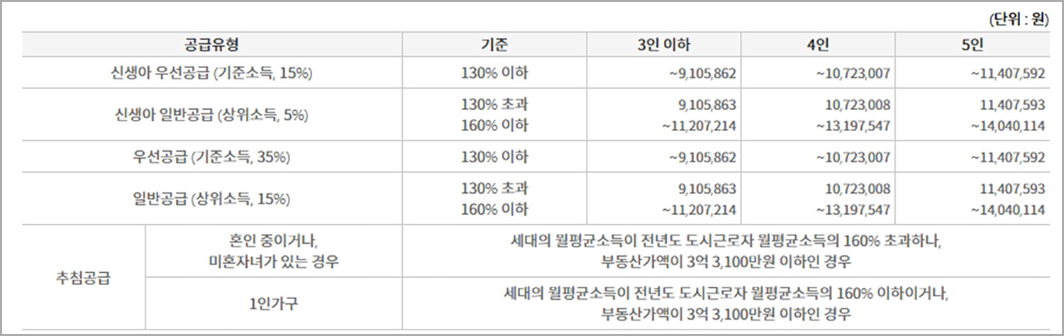 · 우선공급, 신생아 일반공급 낙첨자추첨공급 혼인 상태거나 미혼 자녀 세대의 월평균 소득이 160%를 초과하나 부동산가액이 331,000천 원 이하 1인 가구 세대의 월평균 소득이 160% 이하 또는 부동산가액이 331,000천 원 이하 · 일반공급 낙첨자 반응형'↘ 일반생활' 카테고리의 다른 글