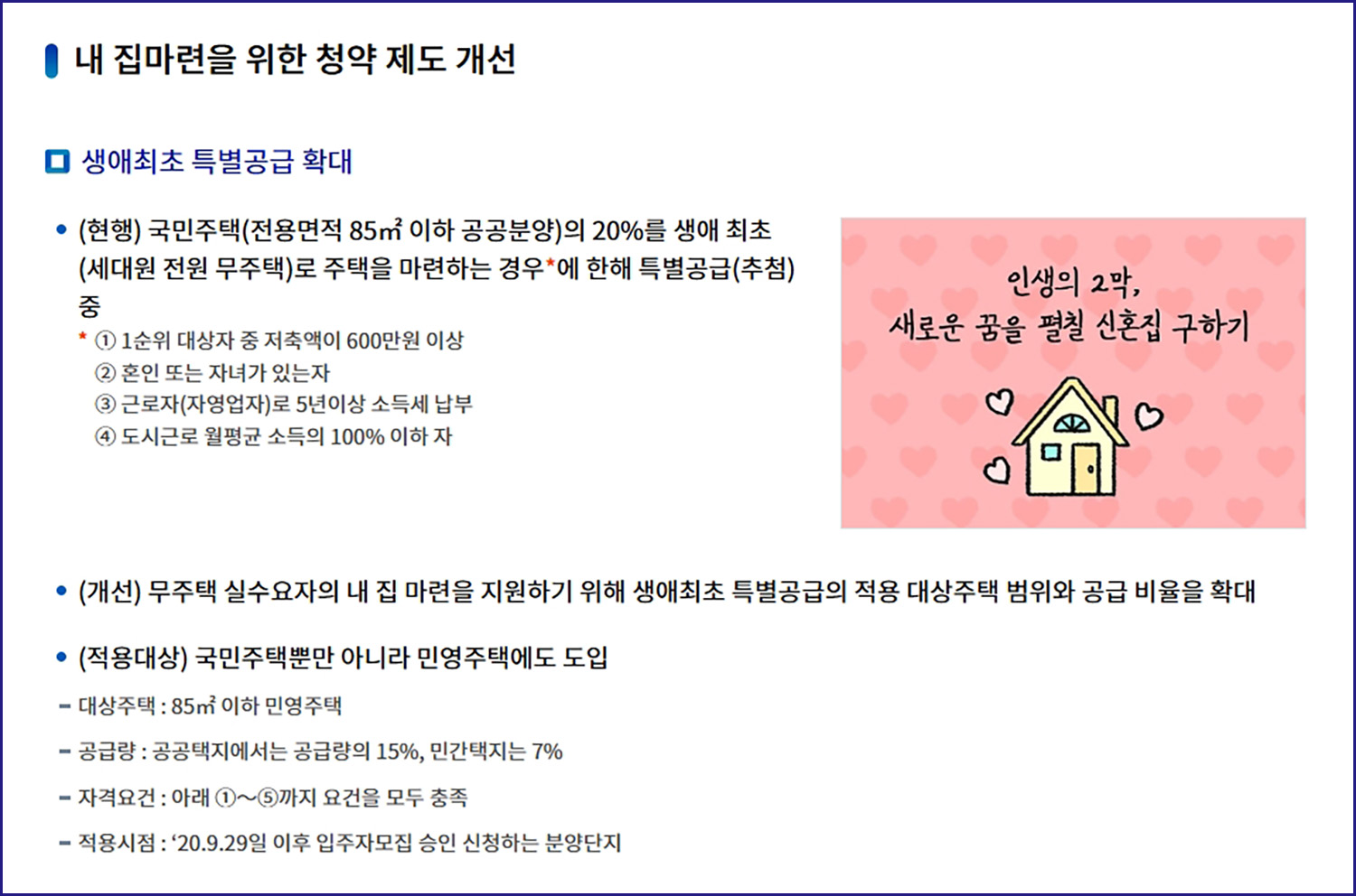 국민주택의 20%, 전용면적 85㎡ 이하 공공분양으로 생애 최초로 무주택자가 주택을 마련하는 경우에 한해 특별 추첨으로 특별공급하는 제도입니다. 공급량은 공공택지는 15%, 민간택지의 경우 7% 이며 요건을 충족해야 대상자가 될 수 있습니다.