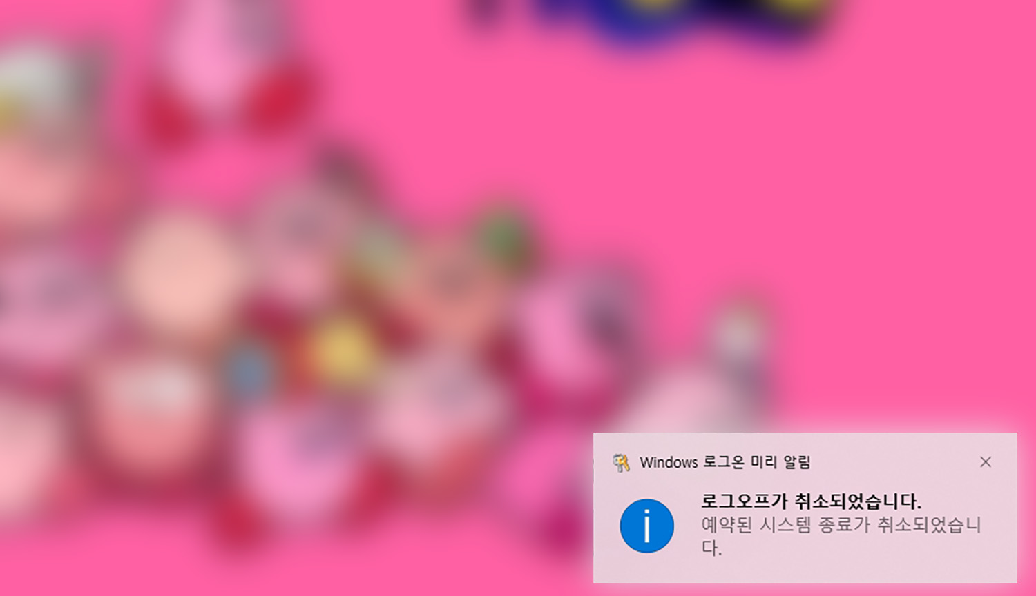 위와 같이 입력하게 되면 윈도우 창 우측 하단에 "예약된 시스템 종료가 취소되었습니다."라는 알림이 뜹니다. 명령어를 알고 있으면 간단한데 모르고 있다면 실행만 하고 취소를 하는 방법을 몰라 헤멜 수도 있는데, 단순히 -a만 입력해 주는 것으로 종료가 취소됩니다.