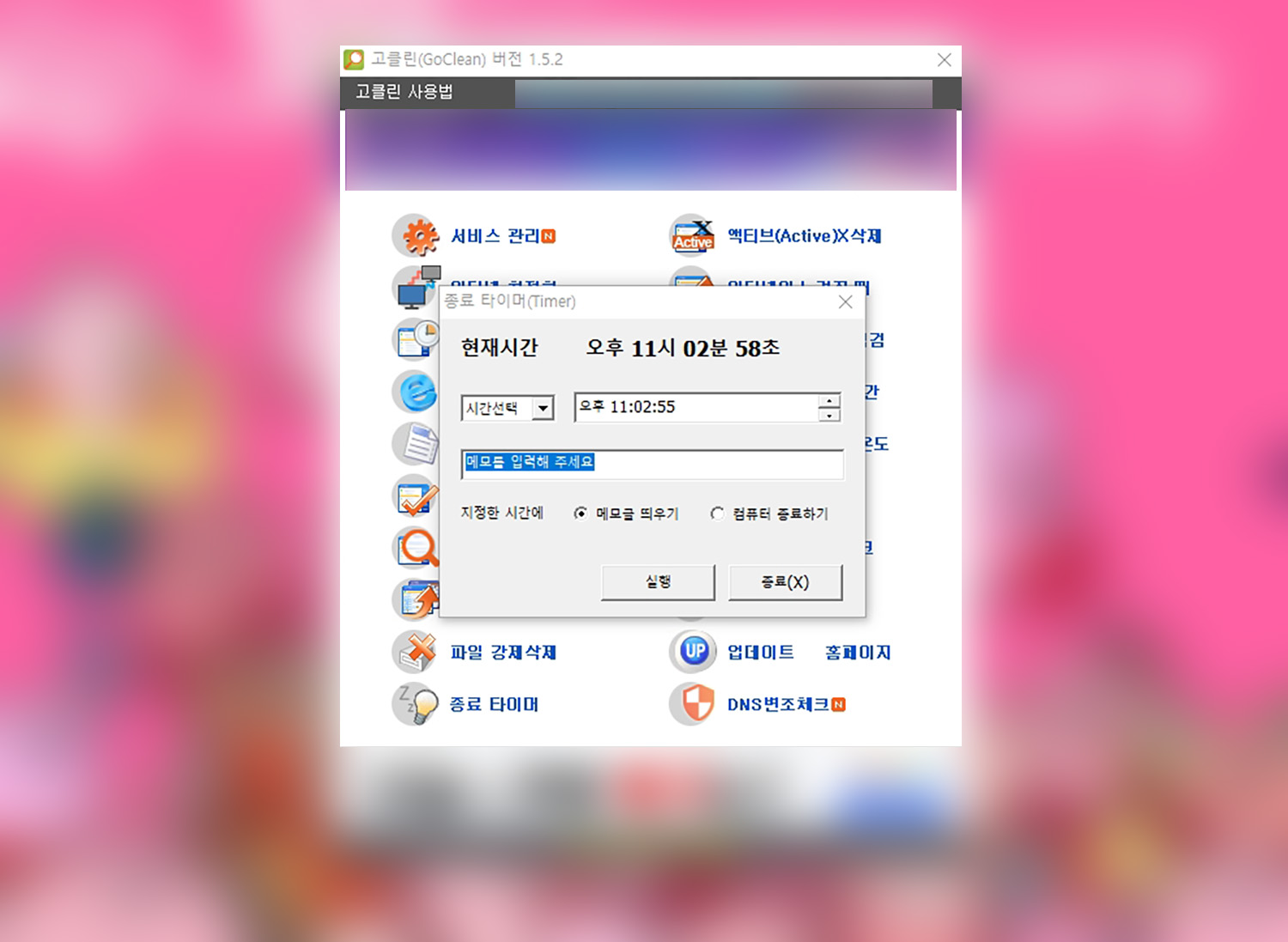 프로그램 중 하나는 '고클린'으로 다른 기능도 함께 가지고 있어 잘 사용하고 있는 것 중 하나입니다. 좌측 하단의 종료 타이머를 클릭하시면 컴퓨터를 자동으로 종료하는 시간 설정을 할 수 있습니다.