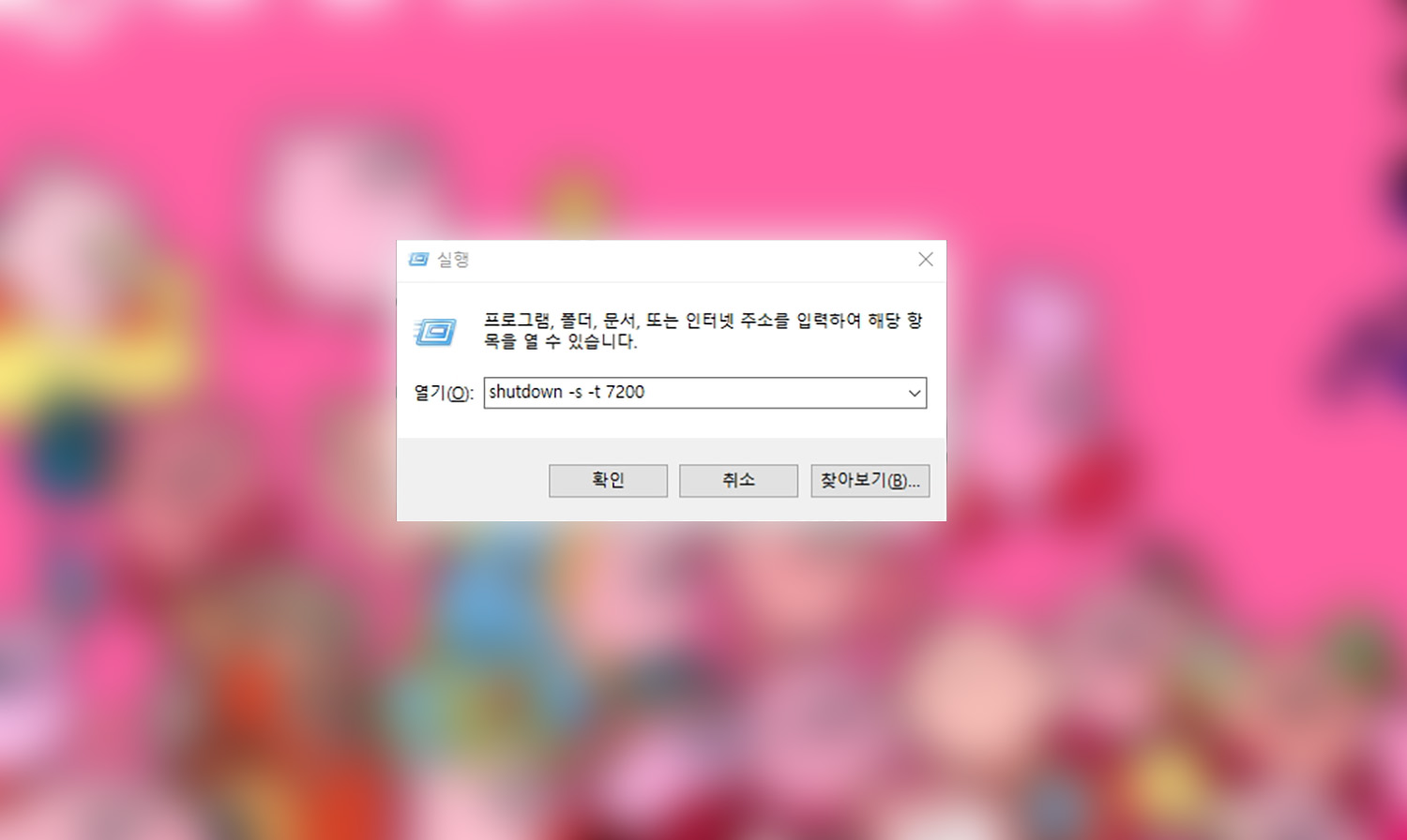 윈도우 키 + R키 누르기 > Shutdown -s -t 7200 입력 후 확인