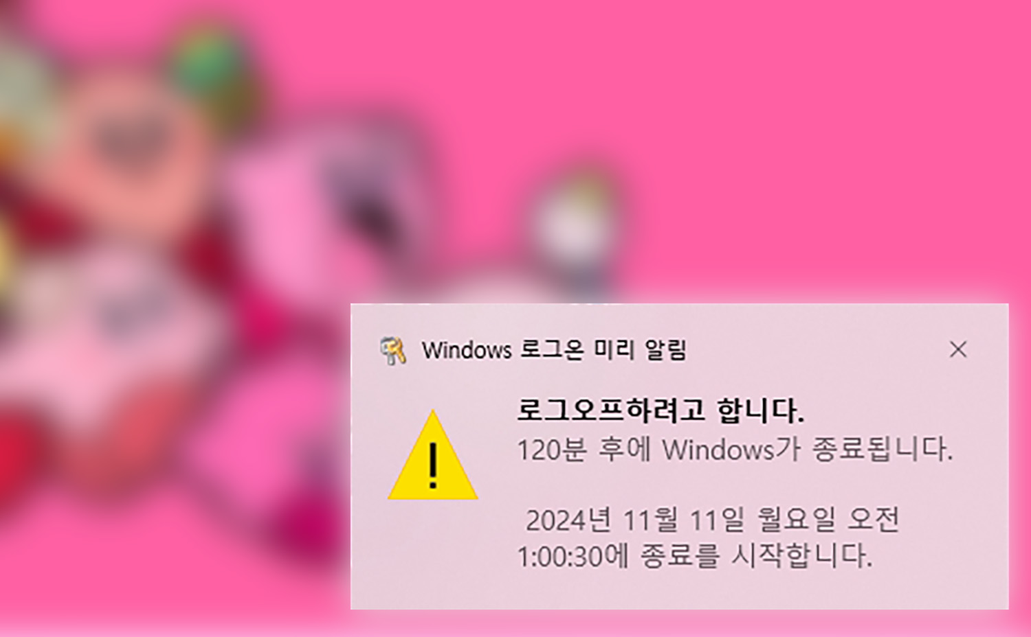위와 같이 실행 창을 열고 명령어를 입력하면 윈도우 화면 우측 하단에 알림이 뜹니다. 7200초를 입력 했기 때문에 2시간인 120분 후에 윈도우가 종료 된다는 내용과 언제 종료 되는지 정확한 날짜와 시간까지 알려 줍니다.