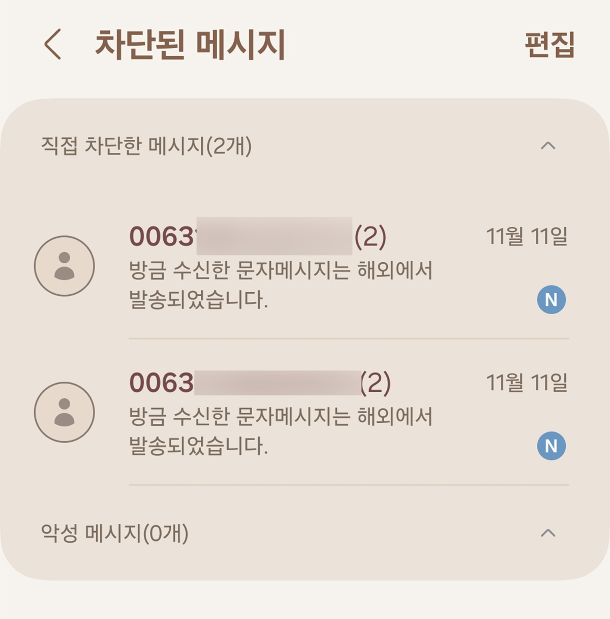 해외에서 발송하는 문자 메시지의 경우 무조건 001 ~ 009가 앞에 붙게 되는데, 이 점을 이용해서 해당 번호로 시작하는 번호를 차단하도록 설정해 주는 방법입니다.