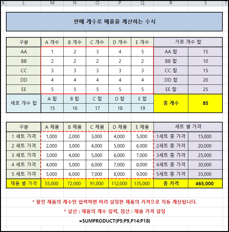 빨간색 점선의 미리 정해 놓은 제품의 가격에 맞춰 판매 개수에 따른 수익을 자동으로 계산하여 정리해주는 수식입니다.
