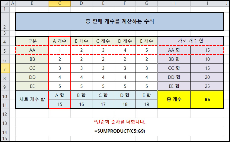 위의 경우 많이 더할 수록 점점 글자수가 많아지며 복잡해지지만, 해당 수식을 사용하면 간단하게 정리할 수 있습니다.