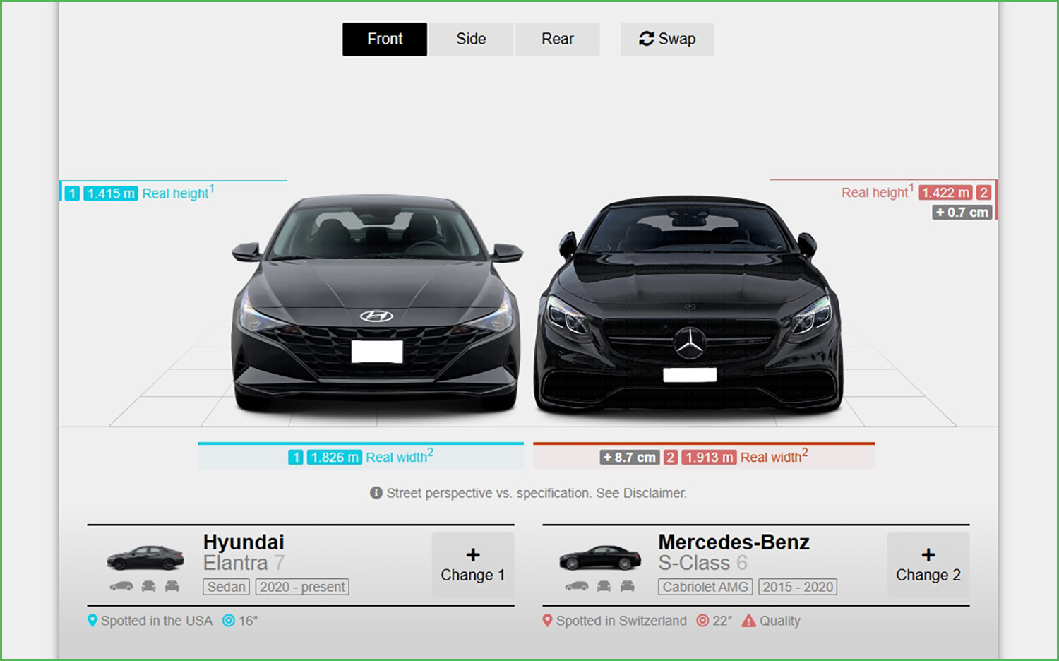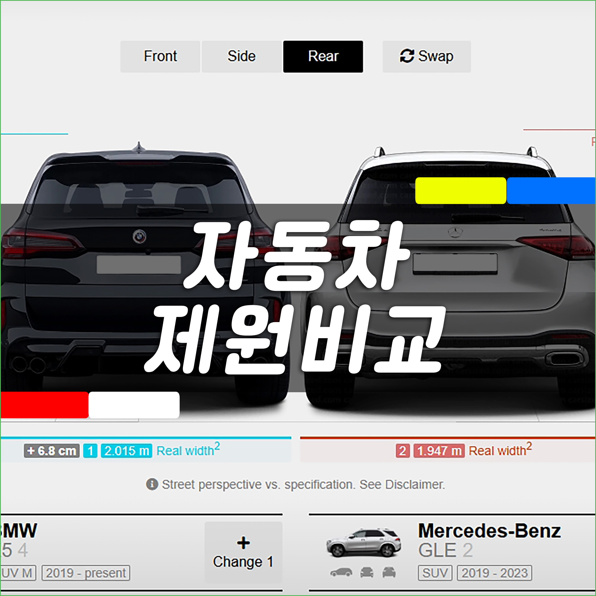 정면으로 맞춰서 폭의 차이도 확인할 수 있어 차량 크기를 비교하기 좋습니다. SUV 같은 경우 얼마나 짐을 많이 실을 수 있는지 세단의 경우 얼마나 앉을 자리가 넉넉할지 가늠해 볼 수 있습니다.